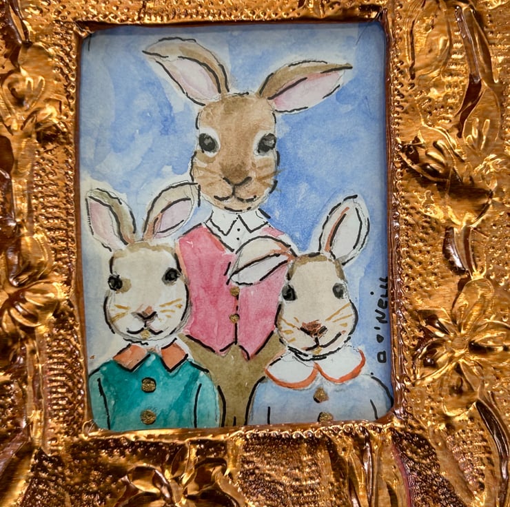 Framed Art - Little Bunnies Family Portrait - Handmade frame and watercolour