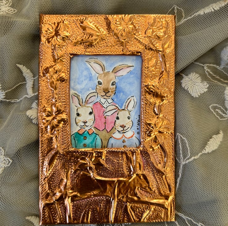 Small original watercolour painting in a handmade embossed frame. The frame is made from aluminium with a copper face and embossed with flowers and a running rabbit.