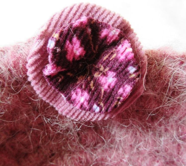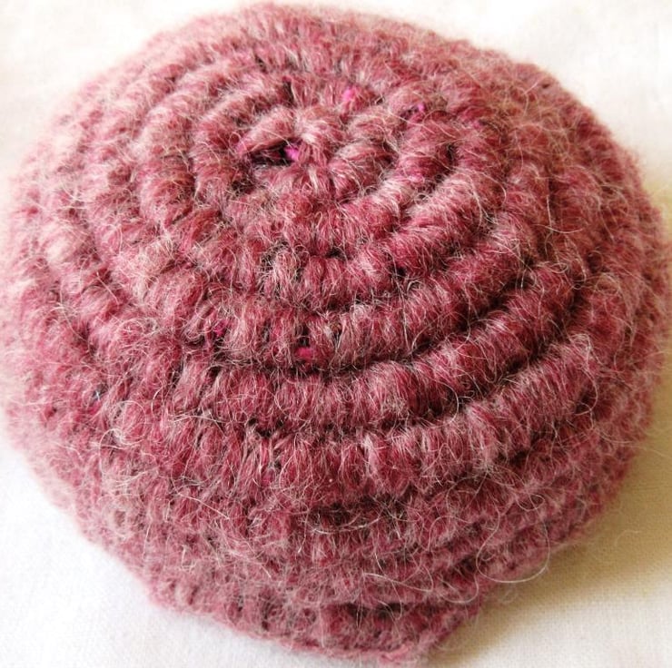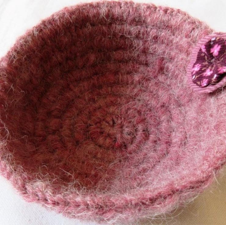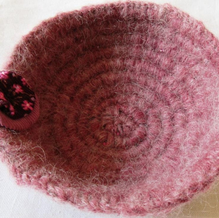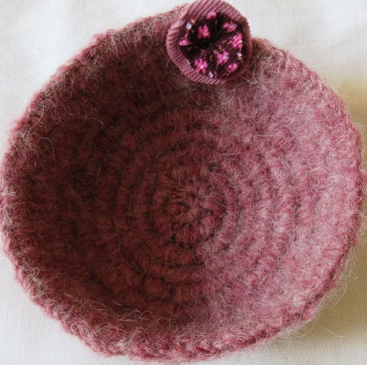 A small crochet basket or bowl in fluffy pink yarn (a mohair-like synthetic yarn). The basket is constructed in a spiral by crocheting over strips of leftover fabric. The rosette decoration (pink-flowered needlecord) shows the fabric that has been used as the base for the crocheting. The basket measures 6"/15 cm in diameter and is 2 - 2.5"/5 - 6 cm deep.