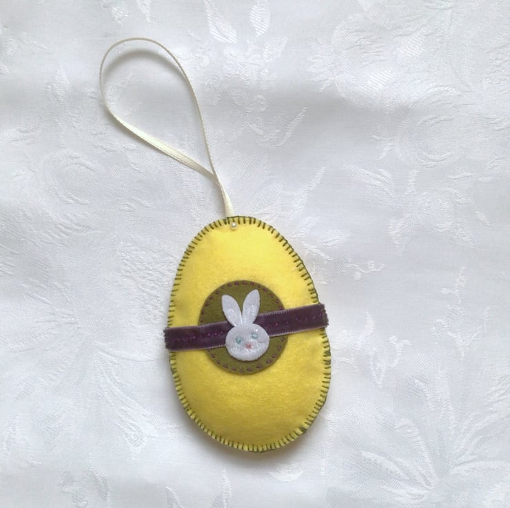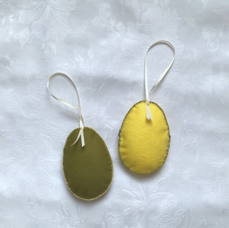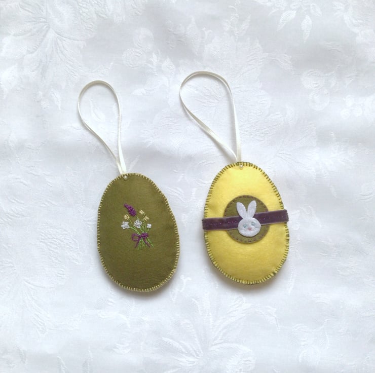 Made from yellow and green felt, all hand stitched edged in blanket stitch. One having a velvet ribbon and rabbit embellishment to the front, the other has a bouquet of spring flowers embroidered to the front.