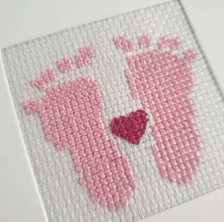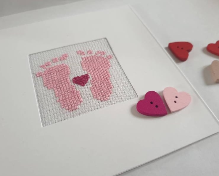 Cute hand-stitched new baby card stitched in pinks and finished with pink heart decorations to celebrate a new baby girl.