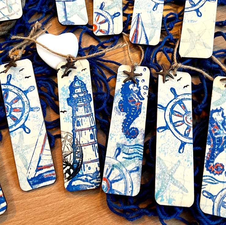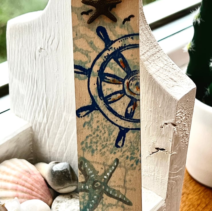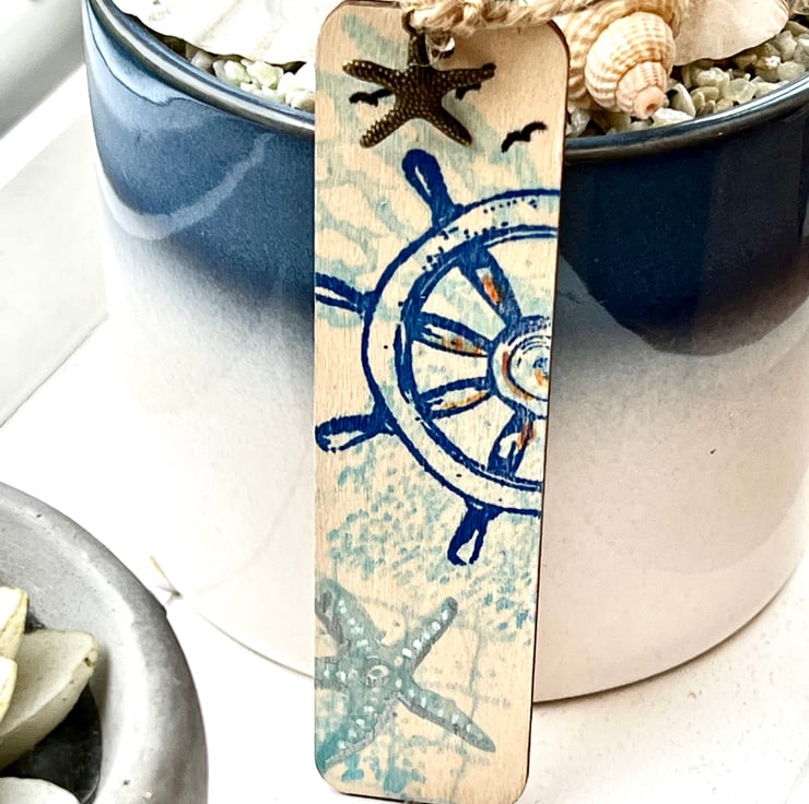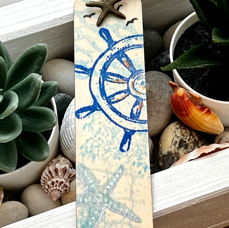 'Wheel Starfish’ Bookmark. This handmade wooden bookmark is approximately 12x3cm in size and can also be used as a decorative item.