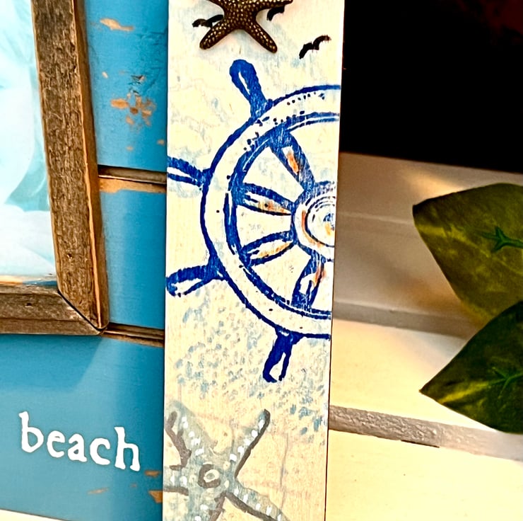 This unique and charming craft is stamped and hand painted with acrylic paints by me. It is finished off with a cute metal starfish charm.
