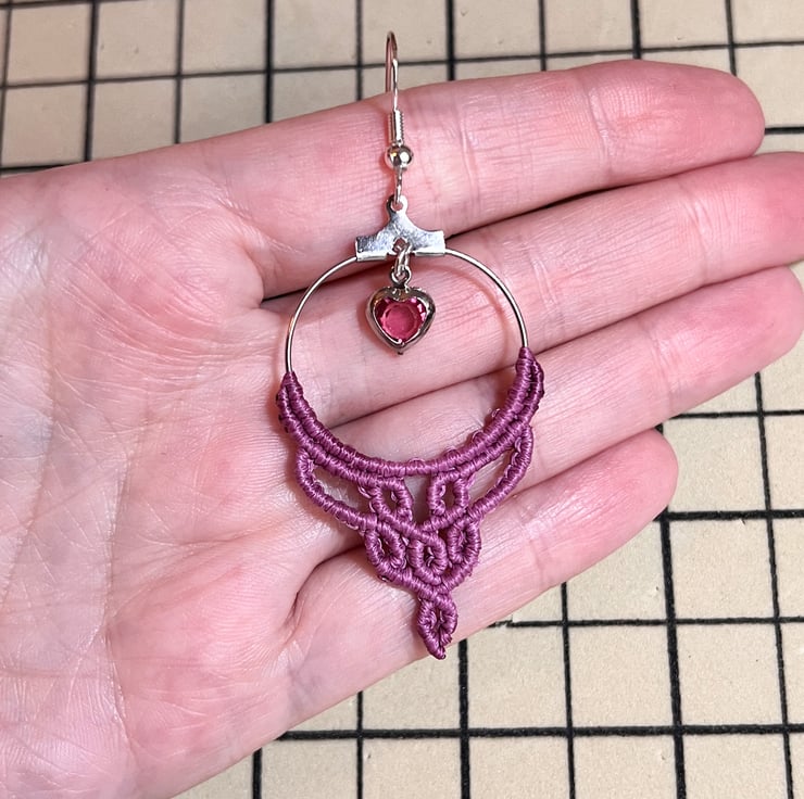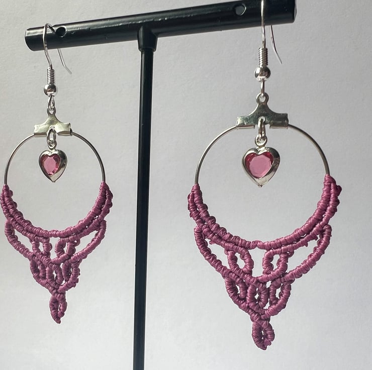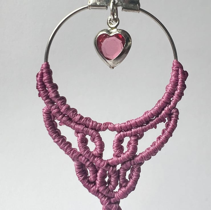Macrame design is made by waxed thread attached and knotted onto silver coloured hoops, embellished with small pink heart.