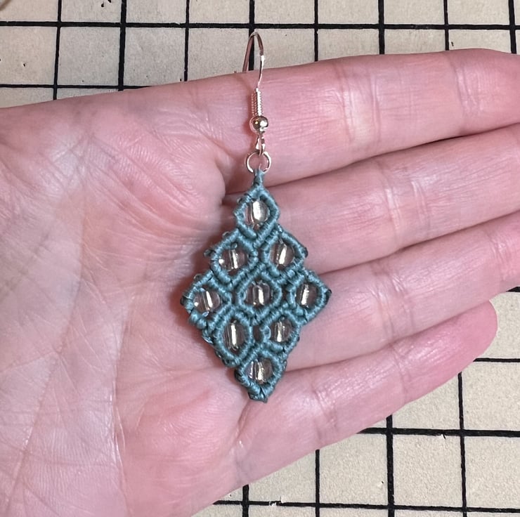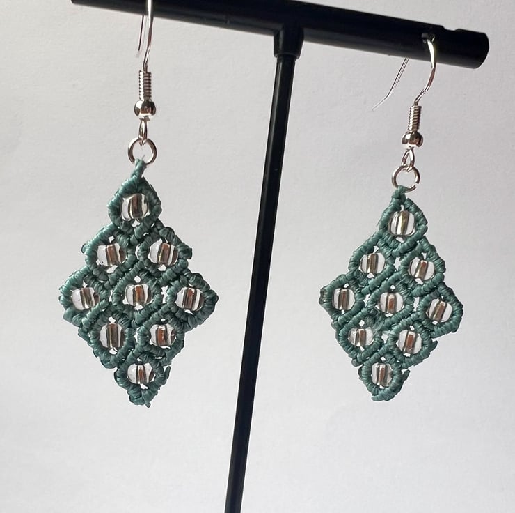 Macrame earrings are made using waxed cord and seed beads and are attached to 925 stamped silver earring hook.