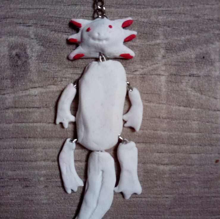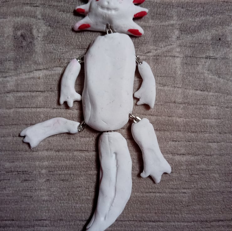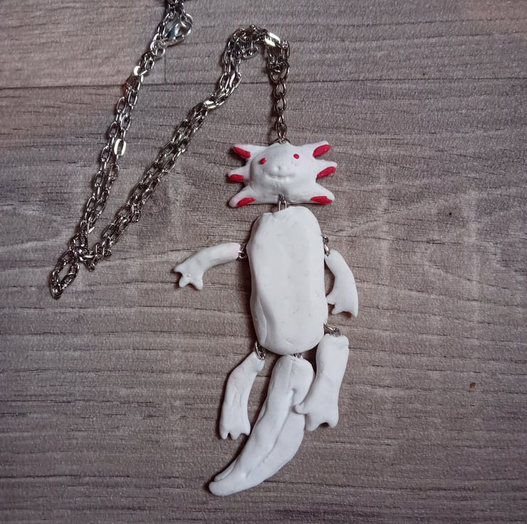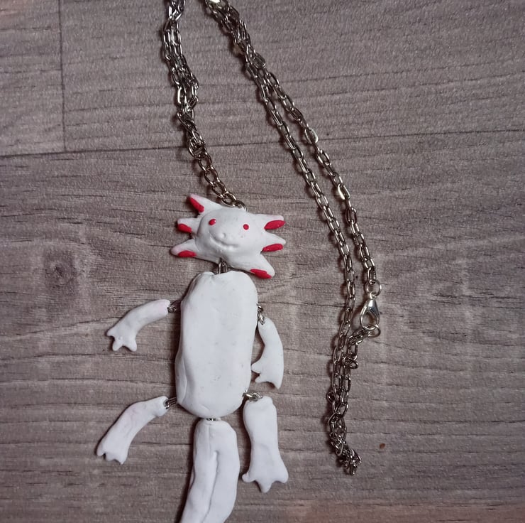 Sure thing! Howdy there! I've got a one-of-a-kind Axolotl necklace/pendant up for grabs. I crafted it with my own hands using polymer clay, and guess what? This little fella's got mov