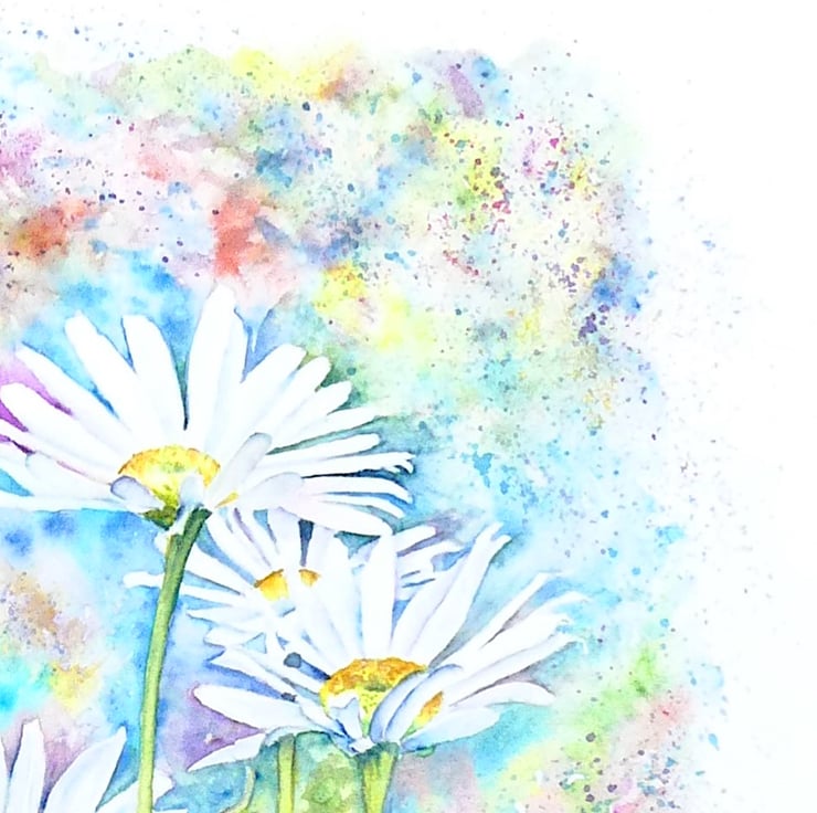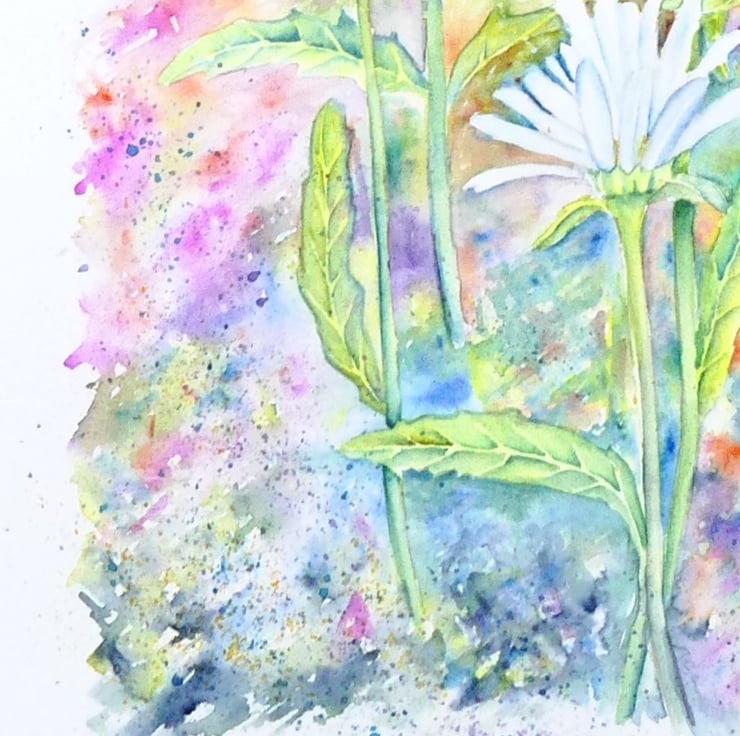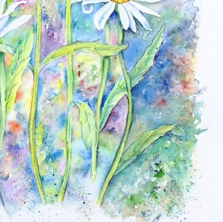 A highly coloured botanical/floral watercolour of ox-eye daisies that thrive in my garden.