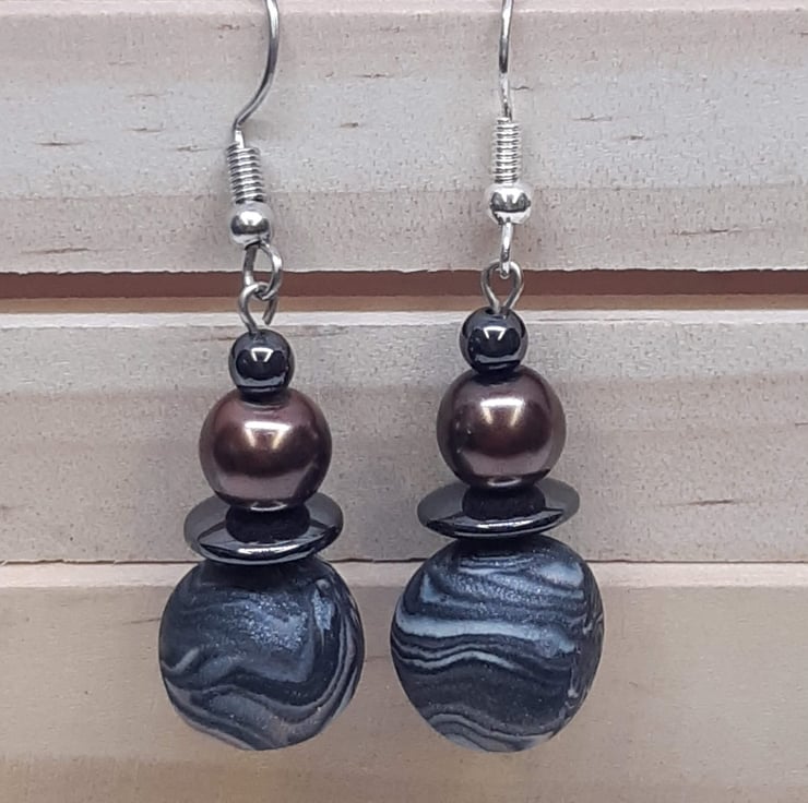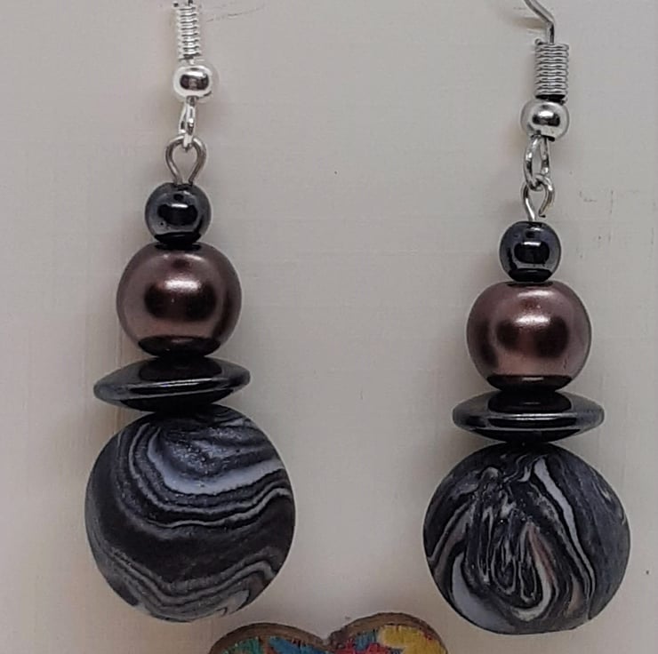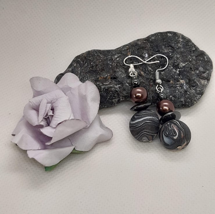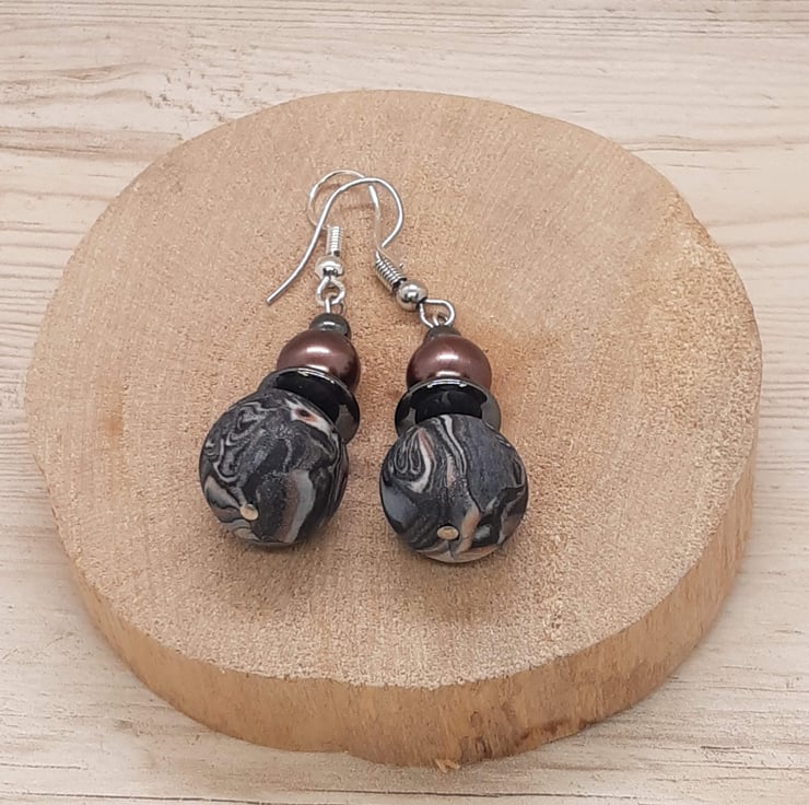 Polymer clay dangly earrings in a black, silver, white and sparkly sienna in a unique swirl design.