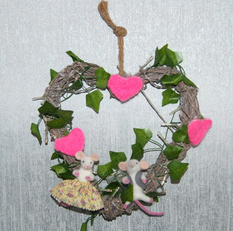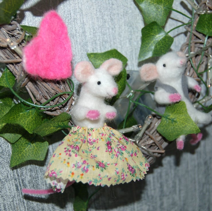 I've used a pre used heart shaped wreath made from small pieces of wood. I've added two needle felted white mice. One dressed in a floral cotton skirt and the other in a felt grey waistcoat. Ivy and fairy lights are wrapped around the wreath. Three pink needle felt hearts add a splash of colour and a small ladybird is hidden in the foliage.
