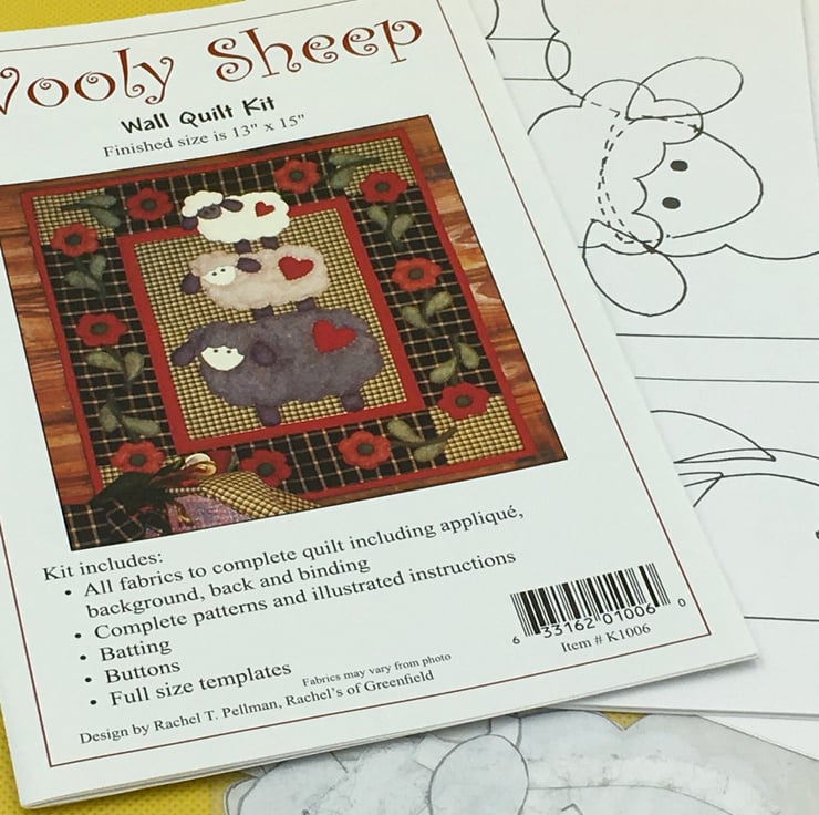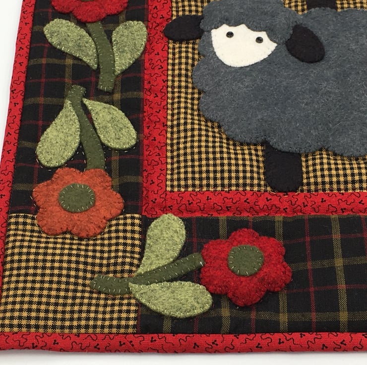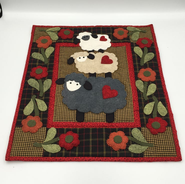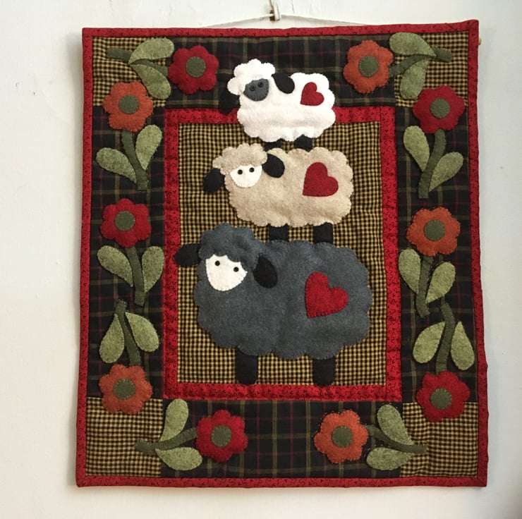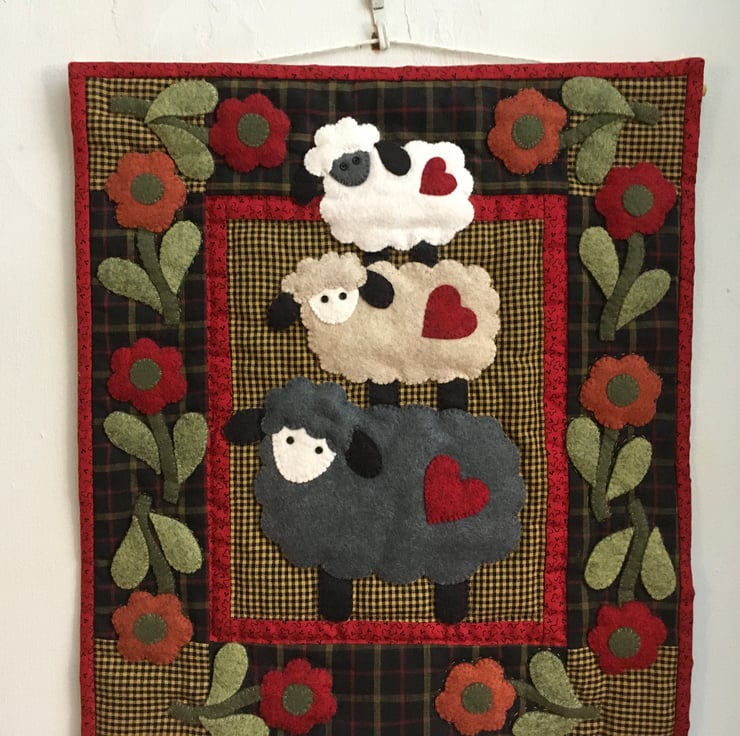It shows a trio of wool felt sheep, Dad, Mum and Lamb in a stack, each with a heart decoration. The quilting cotton backgrounds are checks with a border of nice red flowers and green leaves in wool felt and red binding.