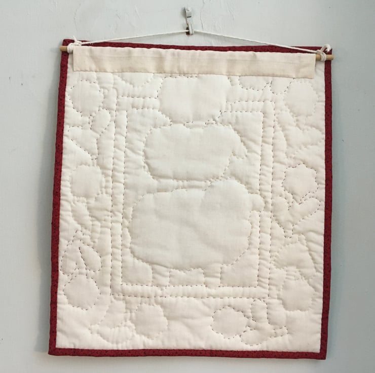 I added a hanging sleeve and dowel rod so this 13” x 15” hand stitched, country art is ready to hang.