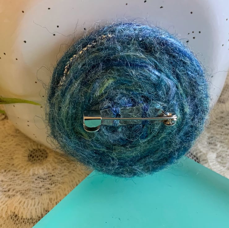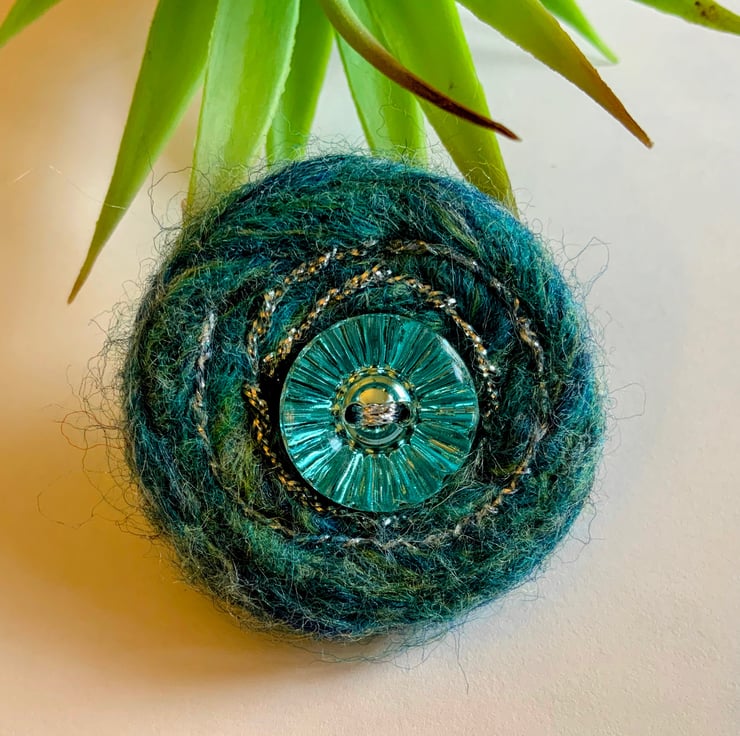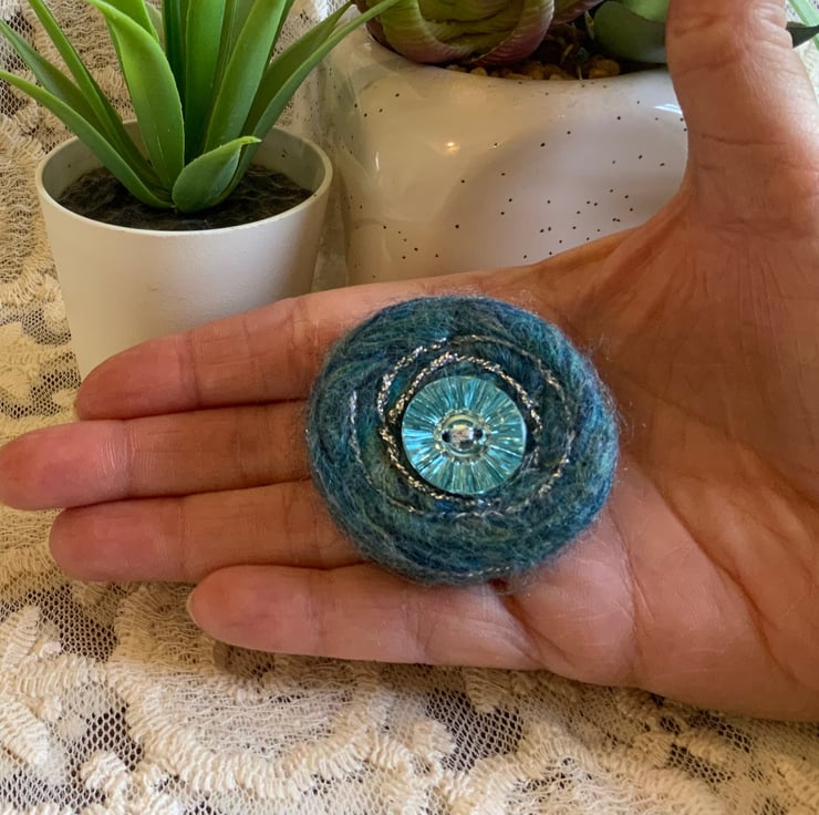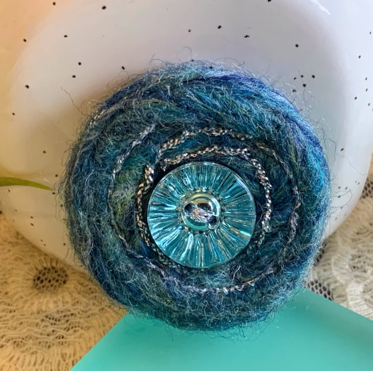 A needle felted brooch made with pure merino wool in ocean mix colours featuring a beautiful sky blue diamond cut glass button. A spiral design has been embroidered with silver silk threads