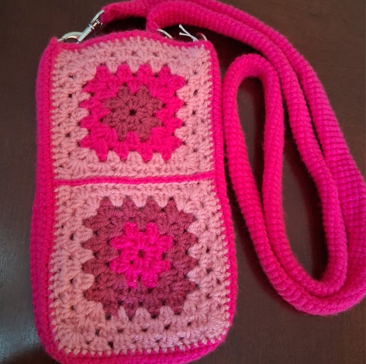 Crossbody phone bag made with pink granny squares on each side. Comes with a gusset so can be used for your phone and a small wallet/keys.