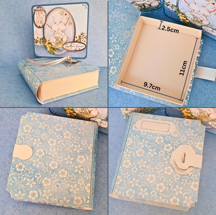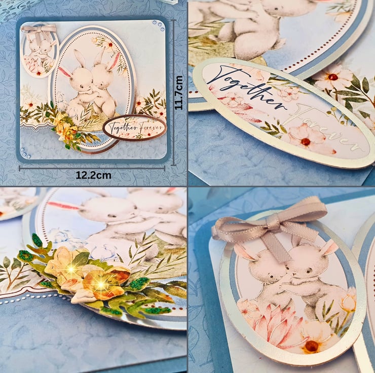 The card is blueish grey layered with patterned cardstock & 3 silver foiled toppers, displaying 2 bunnies & the sentiment "Together Forever". It is embellished with a grey ribbon bow, matching craft pearls, craft gemstones & floral ephemera for dimension. It measures 12.2x11.7cm, with a blank coordinating insert. A small sticker with my shop details has been added at the back. It comes with a white envelope to match the size of the card & it is kept in a clear cellophane bag for protection.