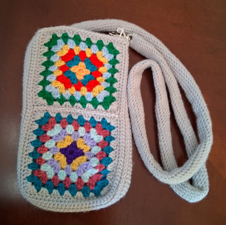 Crossbody phone bag. Light grey and multi coloured granny squares. Comes with a gusset so can be used for your phone and a small wallet/keys.