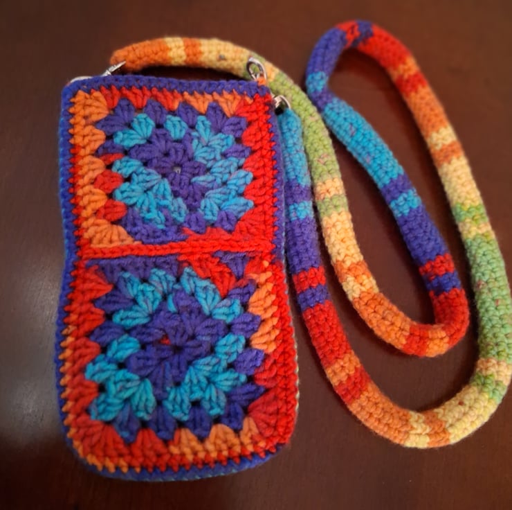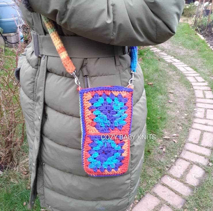 Crossbody phone bag made in granny squares in chunky knit. Comes with a gusset so can be used for your phone and a small wallet/keys.