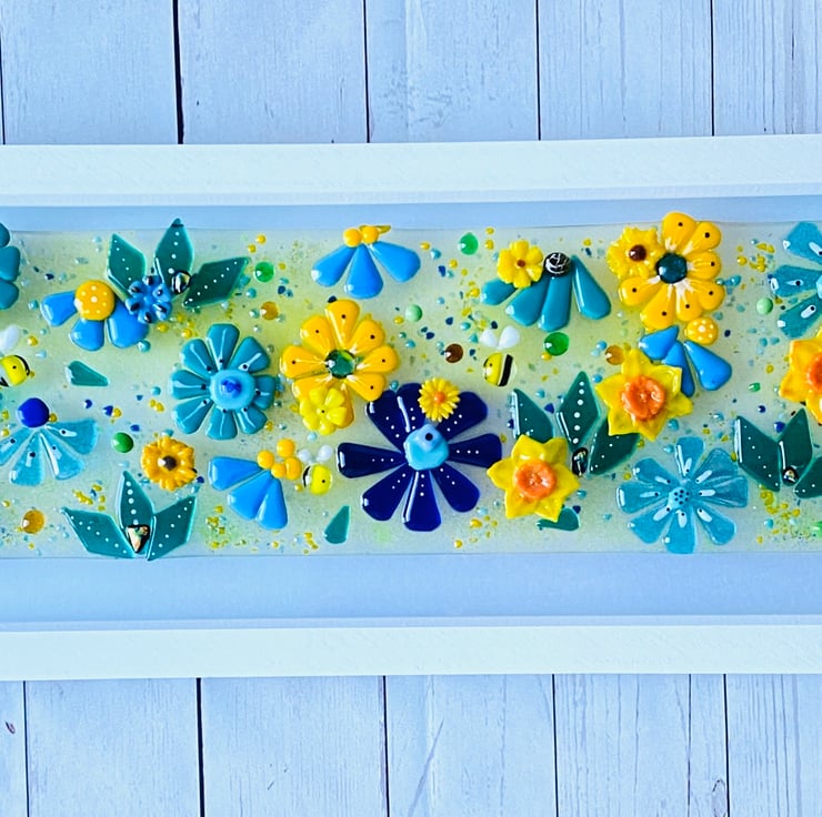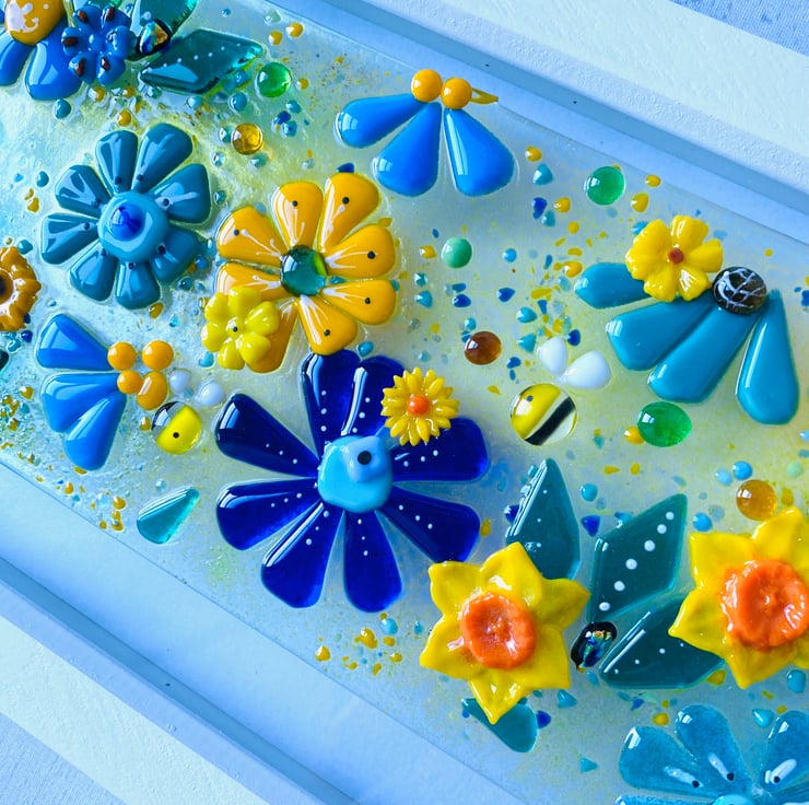 Gorgeous sunny “bird and the bees “ is an interpretation of the “birds and the bees” song I have fond memories of my dad singing . Packed with fused glass flowers, bees and a bird there is so much to see and enjoy . Created over 2 firings in my Kiln .