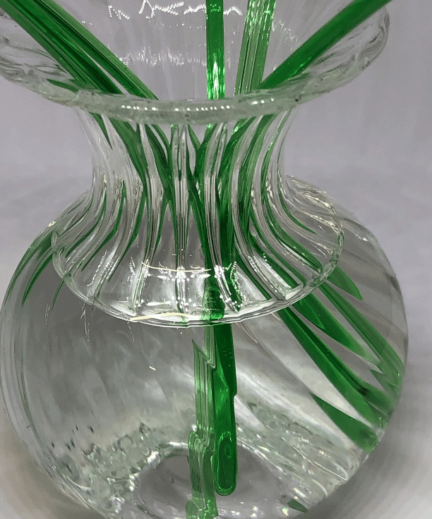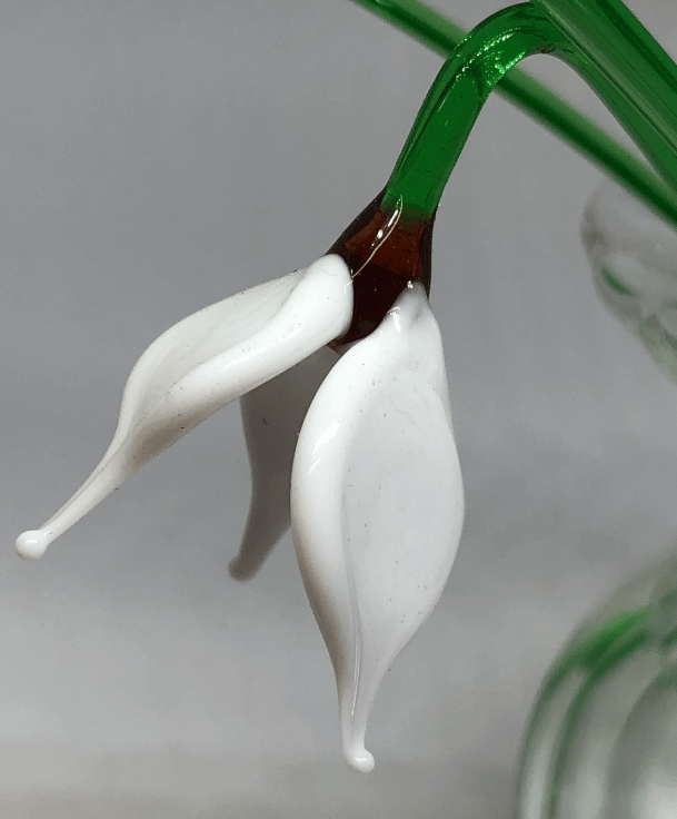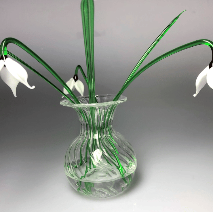 A set of three handmade glass snowdrops made with effetre Italian glass , worked in the flame to form delicate glass daffodils gently leaning over. The vase is made from crystal clear profile tubing which has ridges swirled inside to give a unique pattern on the inside of the vase.The set includes three green glass leaves .