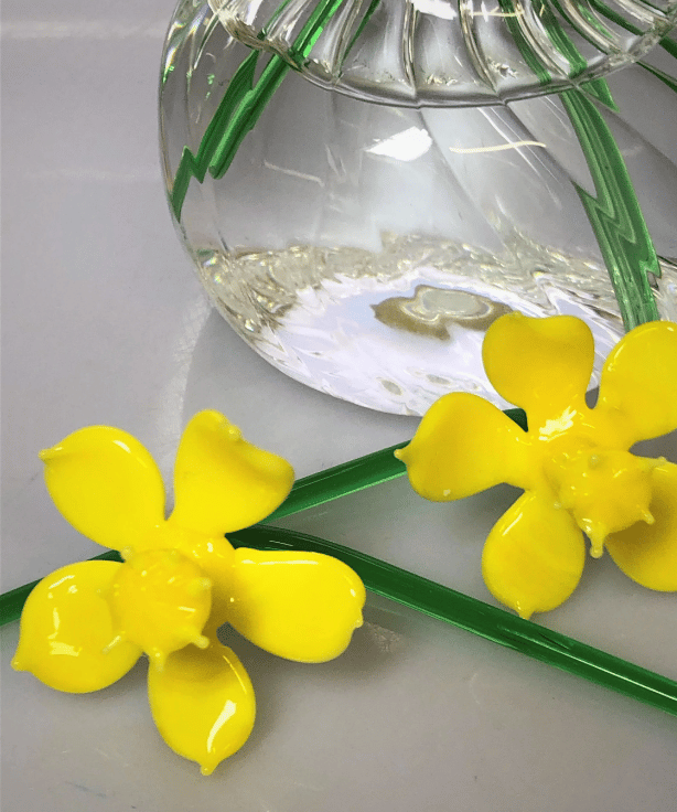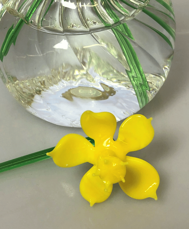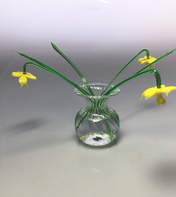 A set of three handmade glass daffodil made with effetre Italian glass , worked in the flame to form delicate glass daffodils gently leaning over. The vase is made from crystal clear profile tubing which has ridges swirled inside to give a unique pattern on the inside of the vase.The set includes three green glass leaves .