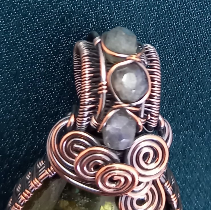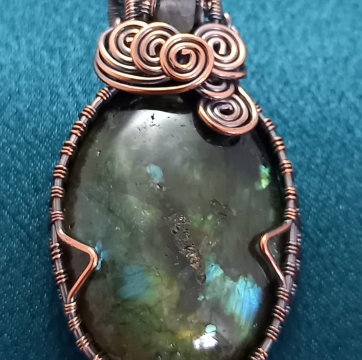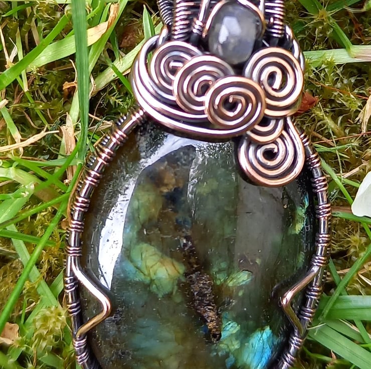 Enveloped in the captivating glow of this exquisite Labradorite gem, I'm transported to the enchanting embrace of Mediterranean seas, shimmering under the golden sun. The flashes within the stone evoke the ebb and flow of coastal waves, creating a magical dance of iridescence. Intertwined copper swirls, reminiscent of delicate seashells scattered along the shore, add an extra layer of enchantment to this piece. Each glance at this mystical creation is a journey to seaside realms, where the allure of nature's wonders and the whispers of the ocean weave a spellbinding tale. Dive into the magic, where Labradorite and copper converge to capture the essence of a sun-kissed coastal dreamscape.