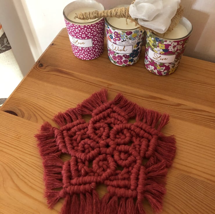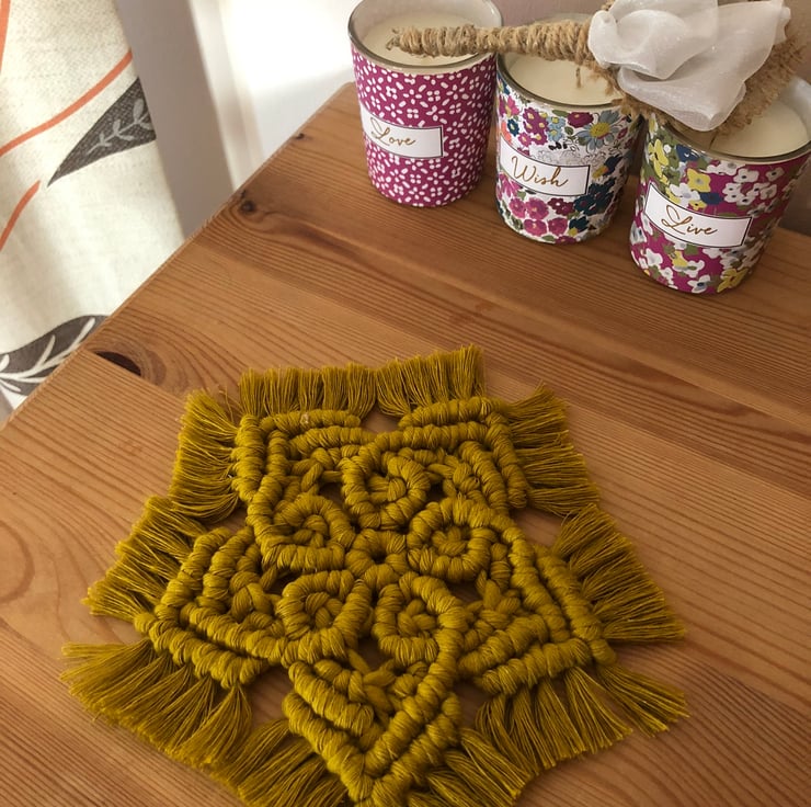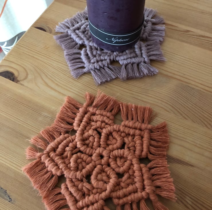 Beautiful handmade macrame coasters made with 3mm recycled cotton cord.