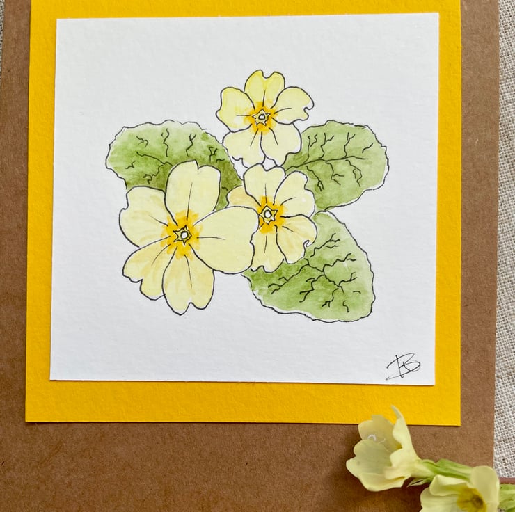 Blank hand painted floral watercolour and ink sketch featuring pretty wild primroses, the original artwork features a trio of delicate primrose flowers and is mounted onto complimentary buttercup yellow card prior to being mounted onto a brown recycled card and is left blank for any occasion or even framed as a tiny piece of affordable art as many of my customers do.