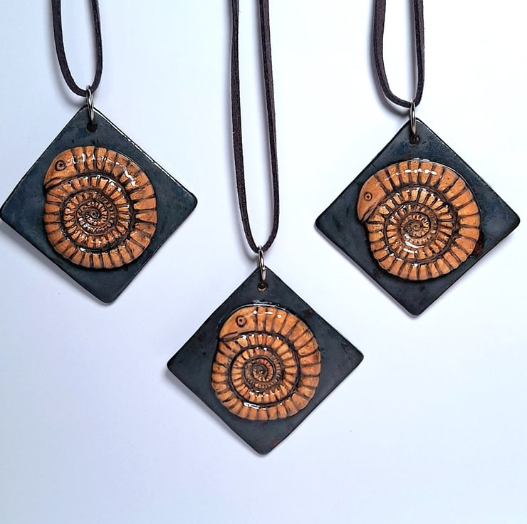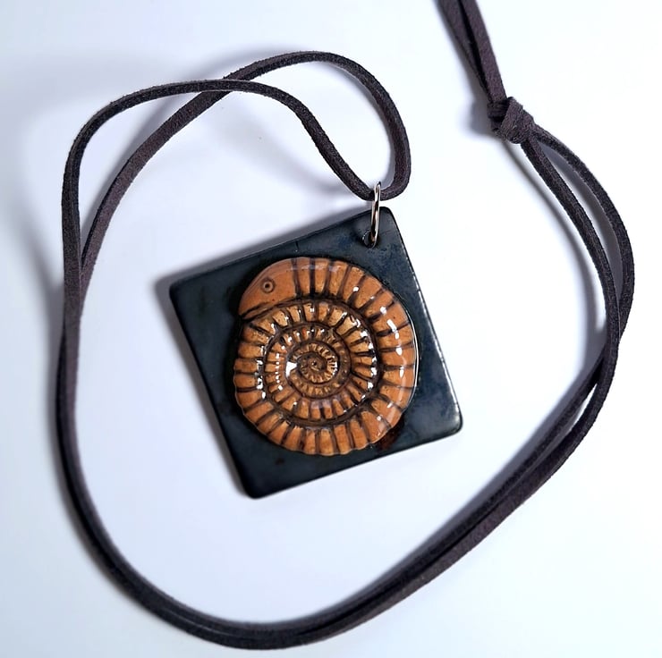 These ceramic ammonite fossil pendants are individually hand-made and hand glazed on both sides by me. Finished in metallic and speckly glazes, they have a silver coloured ring and are threaded onto vegan 'leather' cord.