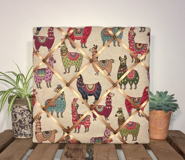 Pictured is a 40x40cm handmade notice board made using llama/alpaca tapestry fabric and finished to the highest quality. The reverse is covered in white fabric with 2 D-rings for hanging. For postage all notice boards are carefully packaged in cellulose wrap and brown parcel paper, which are both biodegradable and compostable.