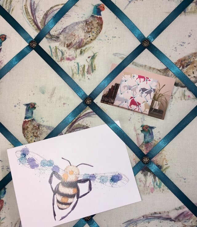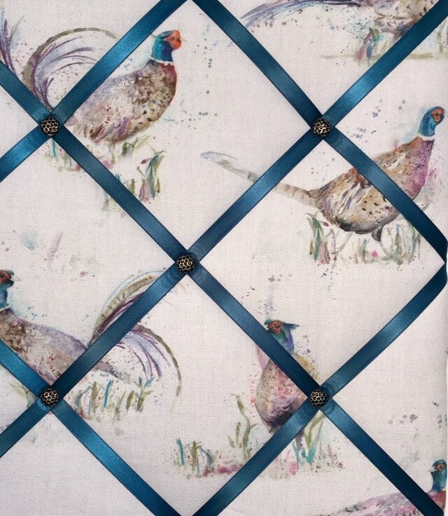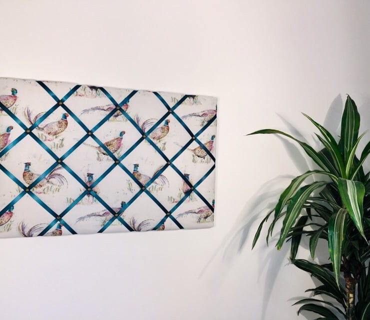 Pictured is a 60x40cm handmade notice board in Voyage Maison pheasant fabric and finished to the highest quality. The reverse is covered in white fabric with 2 D-rings for hanging. For postage all notice boards are carefully packaged in cellulose wrap and brown parcel paper, which are both biodegradable and compostable.