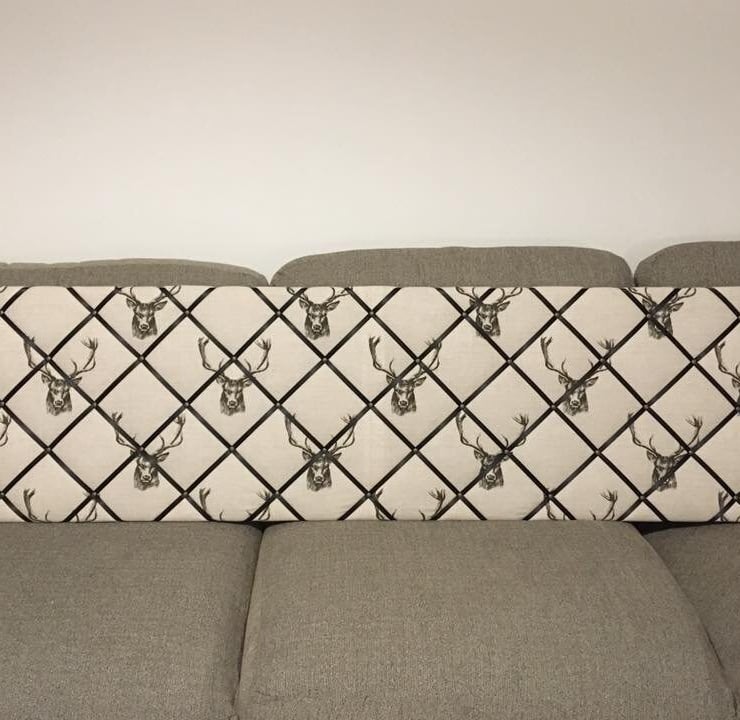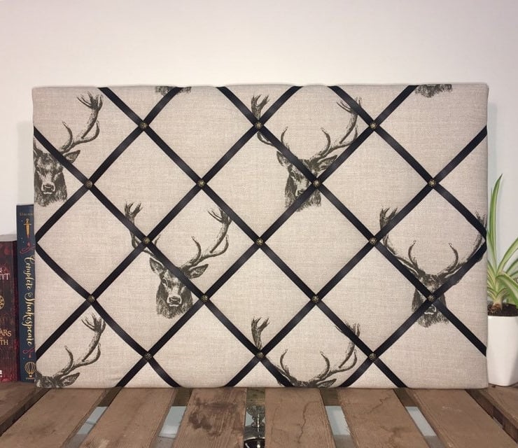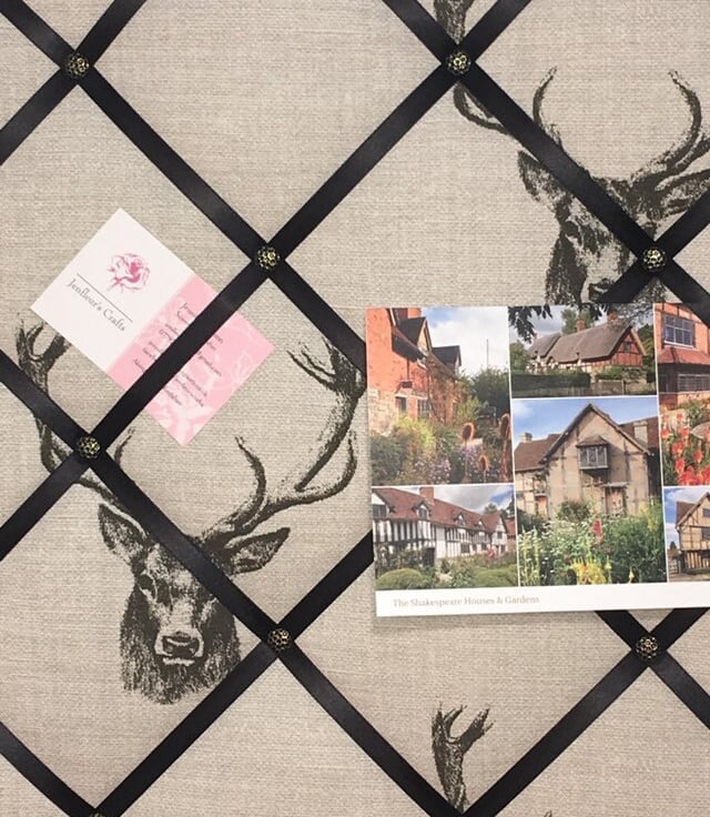 Pictured is a 60x40cm handmade notice board made in Fryetts stag head fabric and finished to the highest quality. The reverse is covered in white fabric with 2 D-rings for hanging. For postage all notice boards are carefully packaged in cellulose wrap and brown parcel paper, which are both biodegradable and compostable.