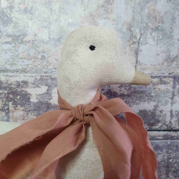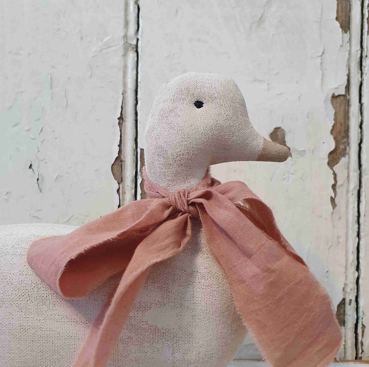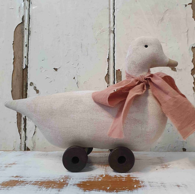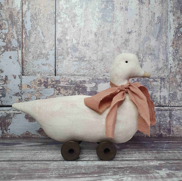 This primitive vintage style toy duck is a lovely addition to you home for spring. It has been made out of aged fabric which I age myself with coffee, cinnamon and vanilla. I then hand paint with white acrylic paint and sand down to give it an aged wooden look. A hand dyed ribbon has been tied to it neck in a lovely big bow and to finish it has been mounted on aged wooden spools.