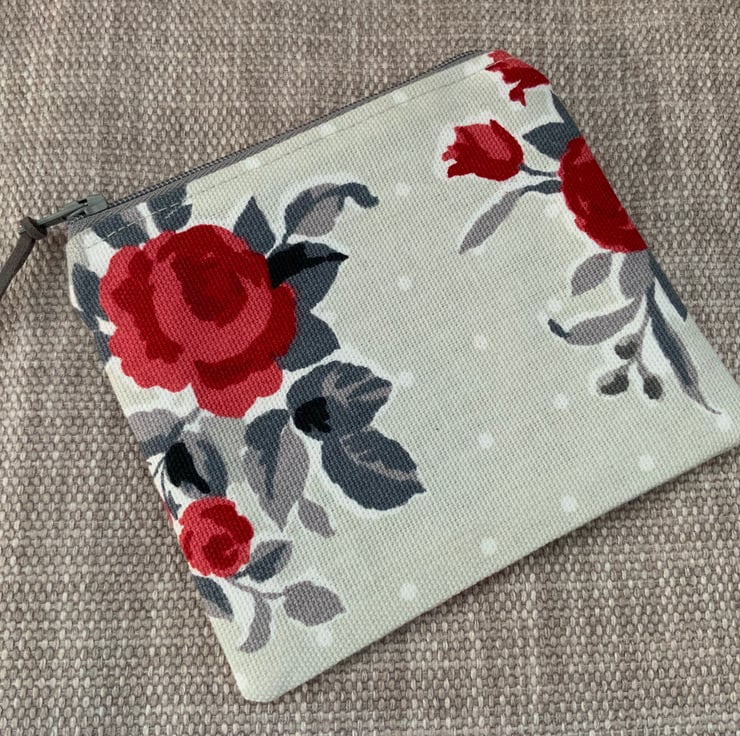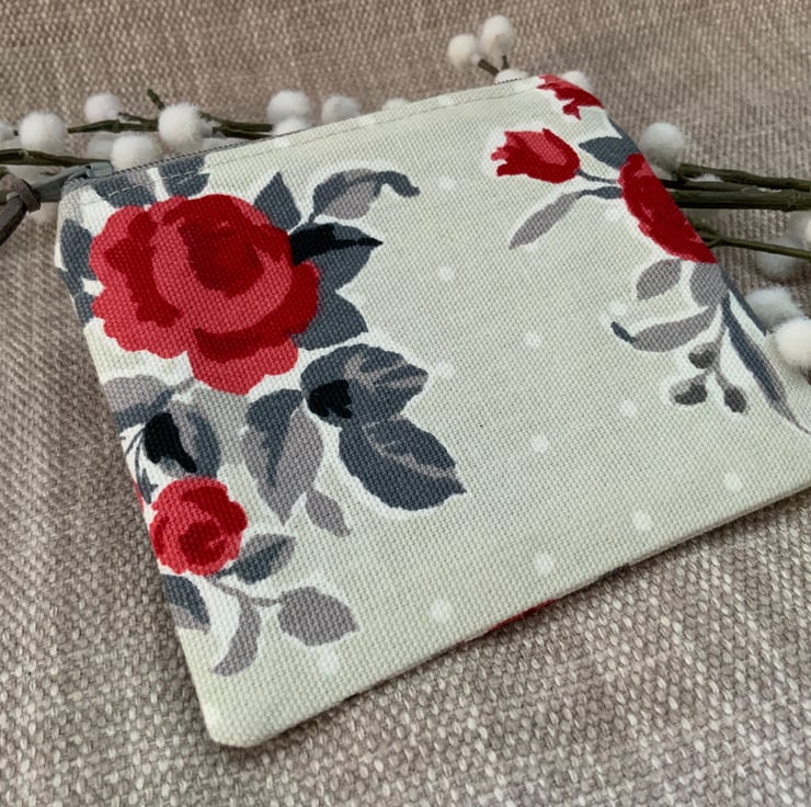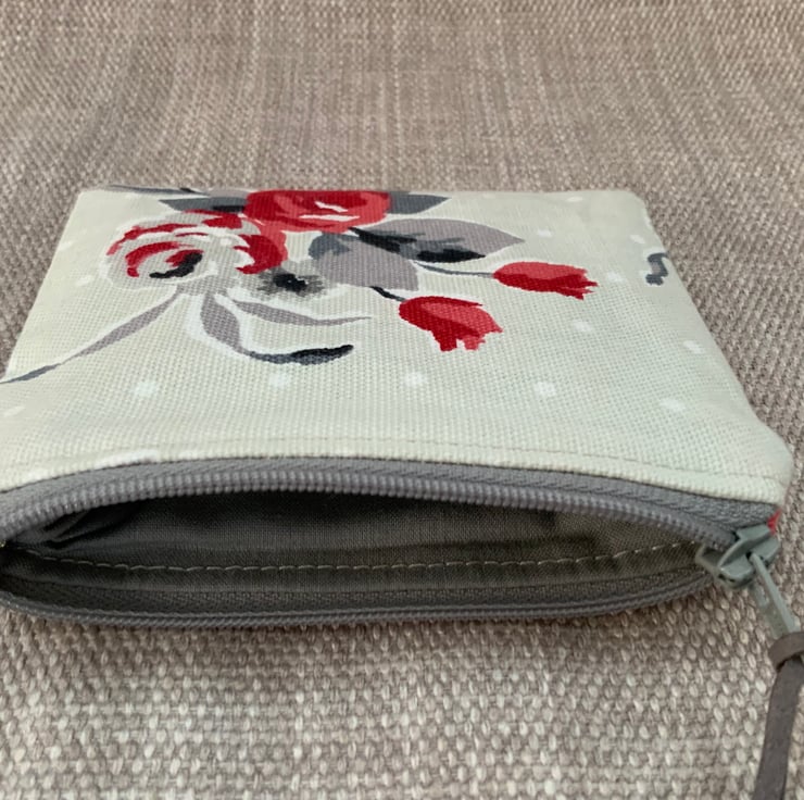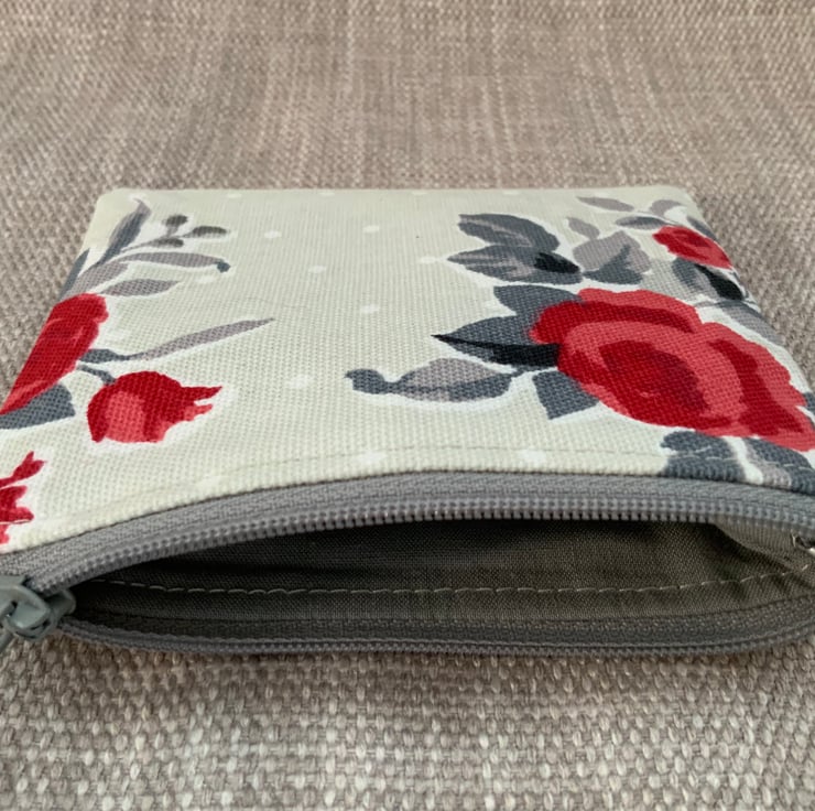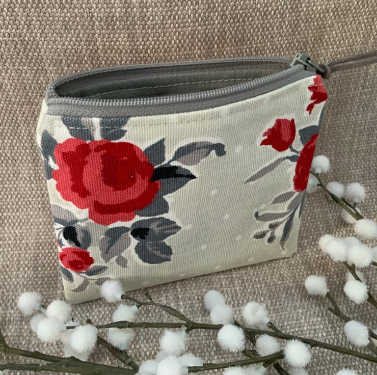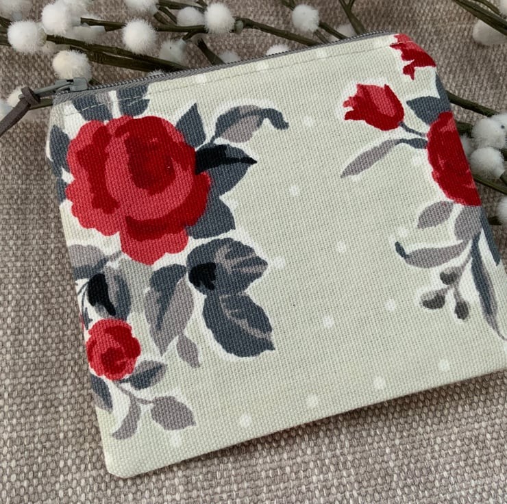 Beautiful coin purse made from 100% cotton fabric with a floral red rose design. It is lightly interfaced to give a little structure. It is lined in grey cotton fabric and finished with a faux suede cord attached to the zip.