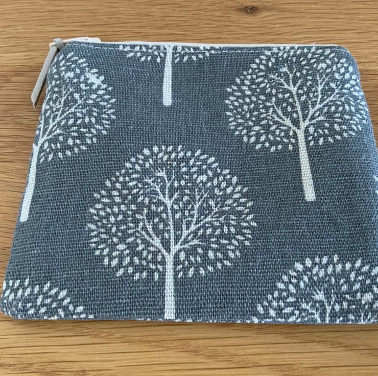Beautiful coin purse made from a canvas type fabric with a mulberry tree design. It is lightly interfaced to give a little structure. It is lined in a coordinating cotton fabric and finished with a faux suede cord attached to the zip.
