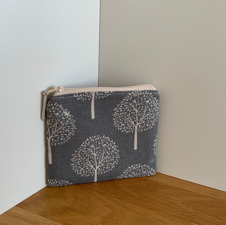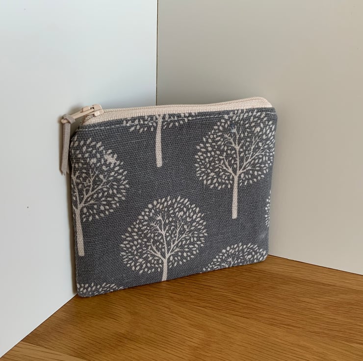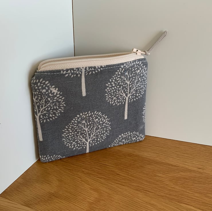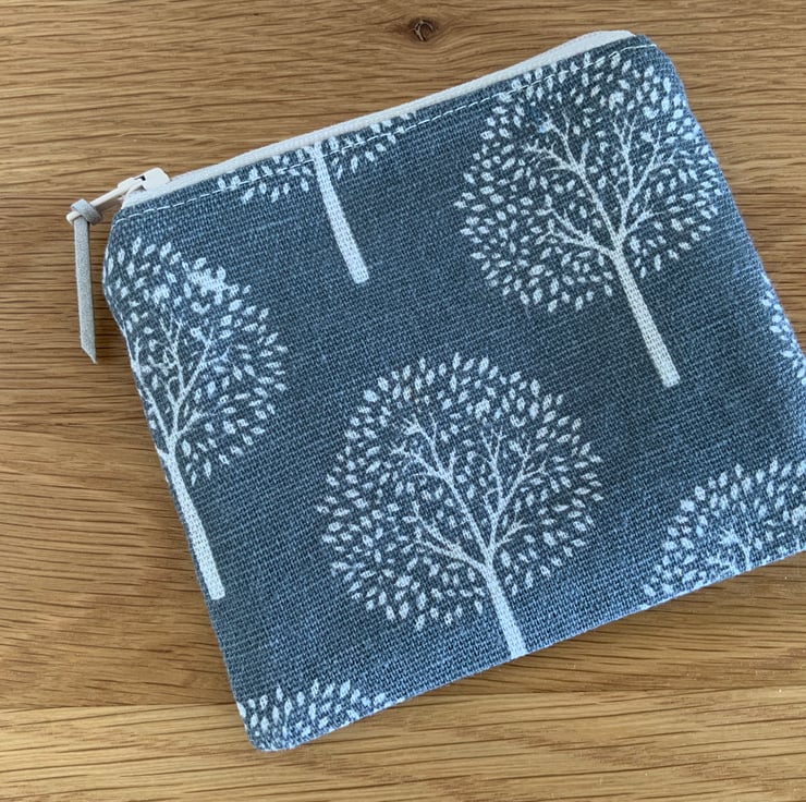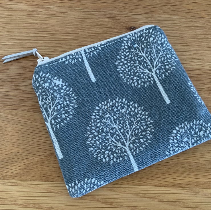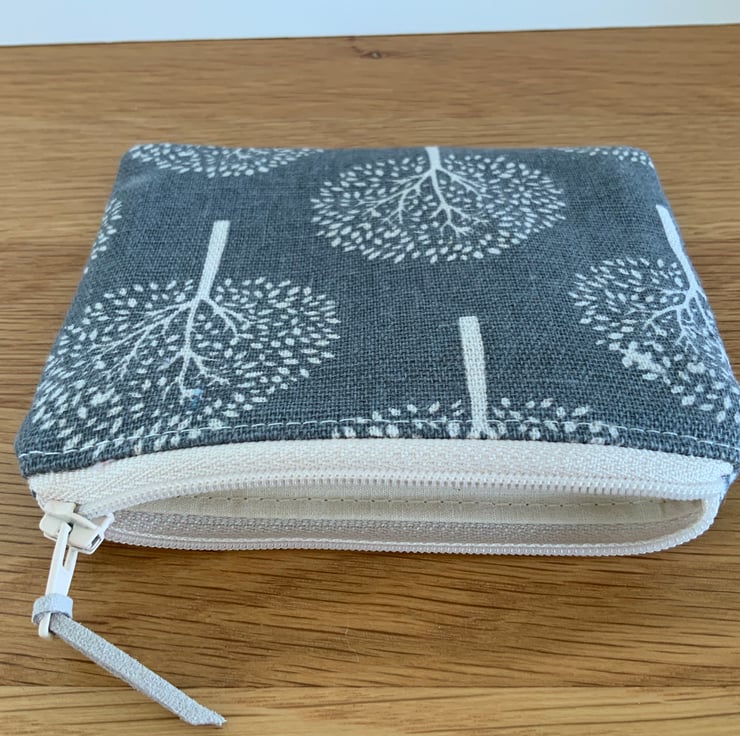 Beautiful coin purse made from a canvas type fabric with a mulberry tree design. It is lightly interfaced to give a little structure. It is lined in a coordinating cotton fabric and finished with a faux suede cord attached to the zip.