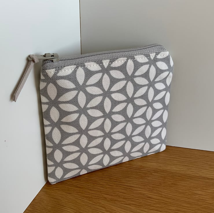 Beautiful coin purse made from cotton fabric in a geometric design. It is lightly interfaced to give a little structure. It is lined in a coordinating cotton fabric and finished with a faux suede cord attached to the zip.
