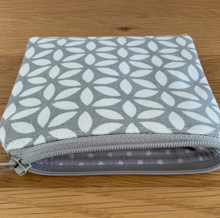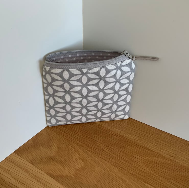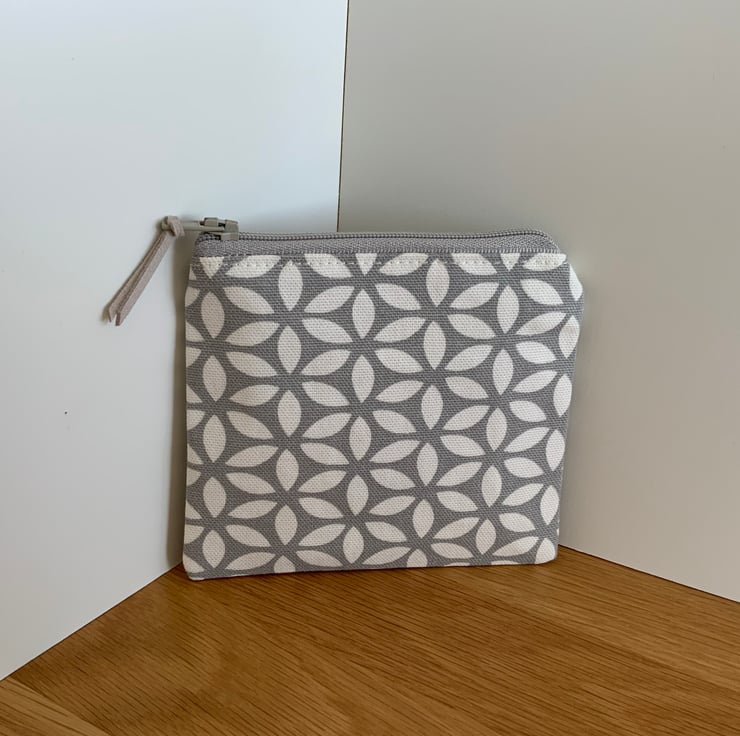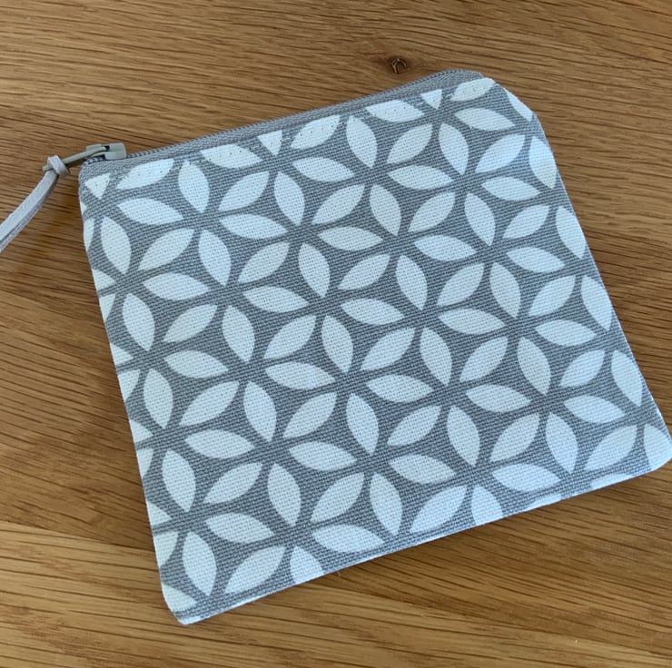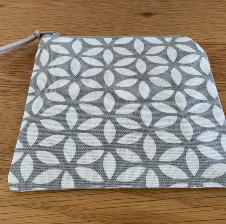 Beautiful coin purse made from cotton fabric in a geometric design. It is lightly interfaced to give a little structure. It is lined in a coordinating cotton fabric and finished with a faux suede cord attached to the zip.
