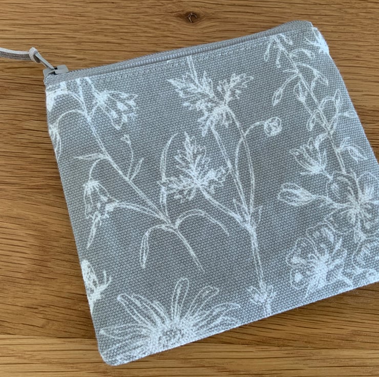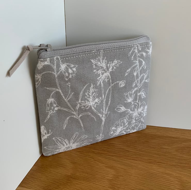 Beautiful coin purse made from Laura Ashley ‘Lisette’ fabric. It is lightly interfaced to give a little structure. It is lined in a coordinating cotton fabric and finished with a faux suede cord attached to the zip.