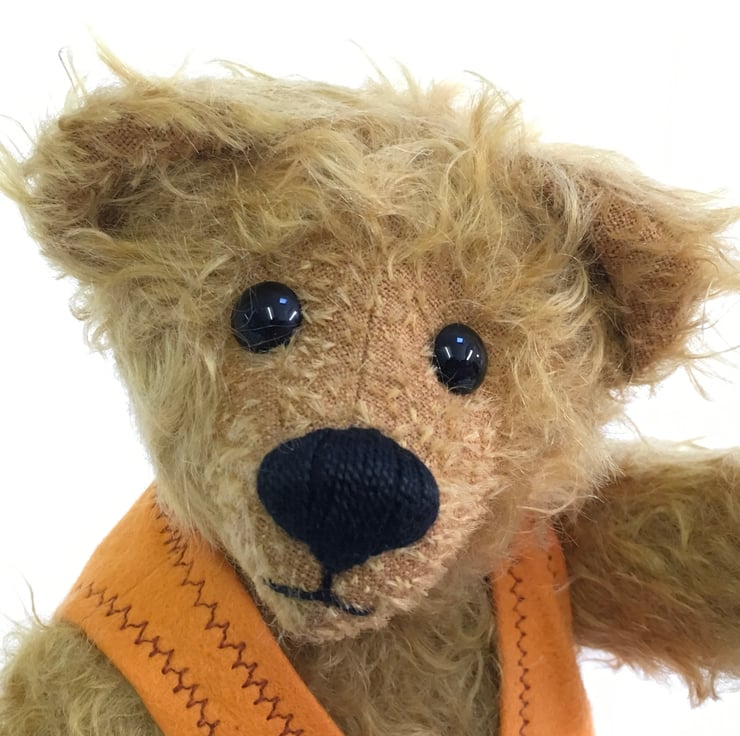 He will be 13 1/2” tall.The main fabric is Ratinee Mohair by Helmbold in Copper Gold; he has glass boot button eyes, split pin joints and paw and foot pads of upholstery velvet.