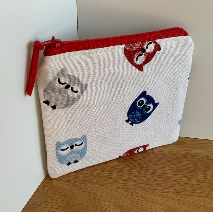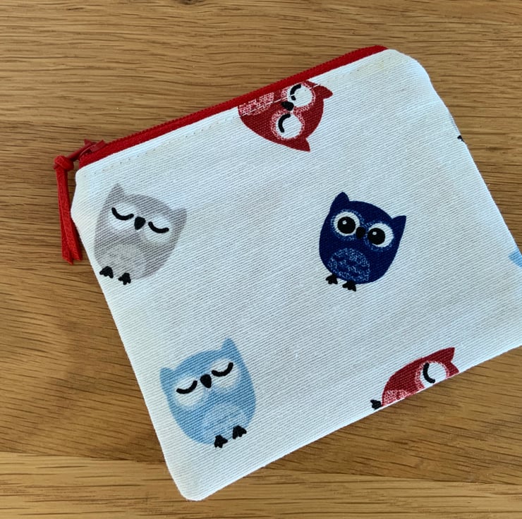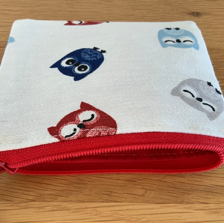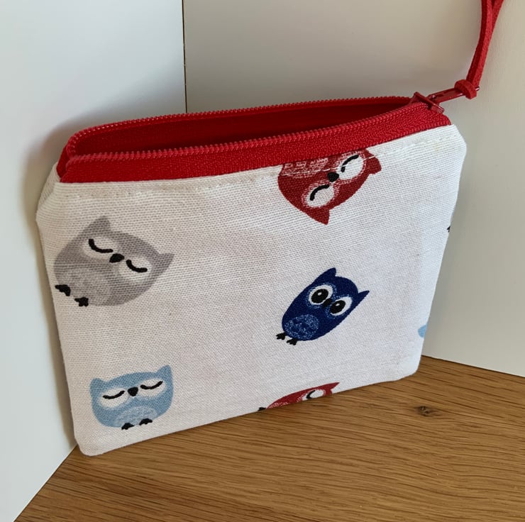 Beautiful coin purse made from cotton fabric in a owl design. It is lightly interfaced to give a little structure. It is lined in a coordinating cotton fabric and finished with a faux suede cord attached to the zip.