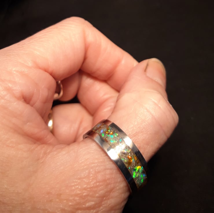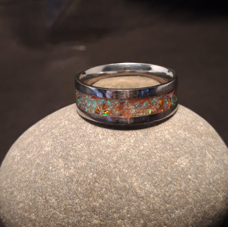 This steel core ring has been inlayed with a stunning crushed bello opal. The colours flit between green, blue and orange depending on the light. This is a uk size W and approx 8mm in depth. Belo opal is a synthetic opal, much harder than mined opals and kinder to the environment.