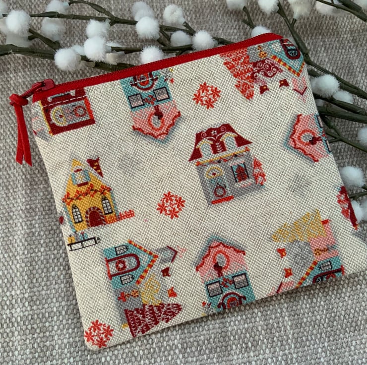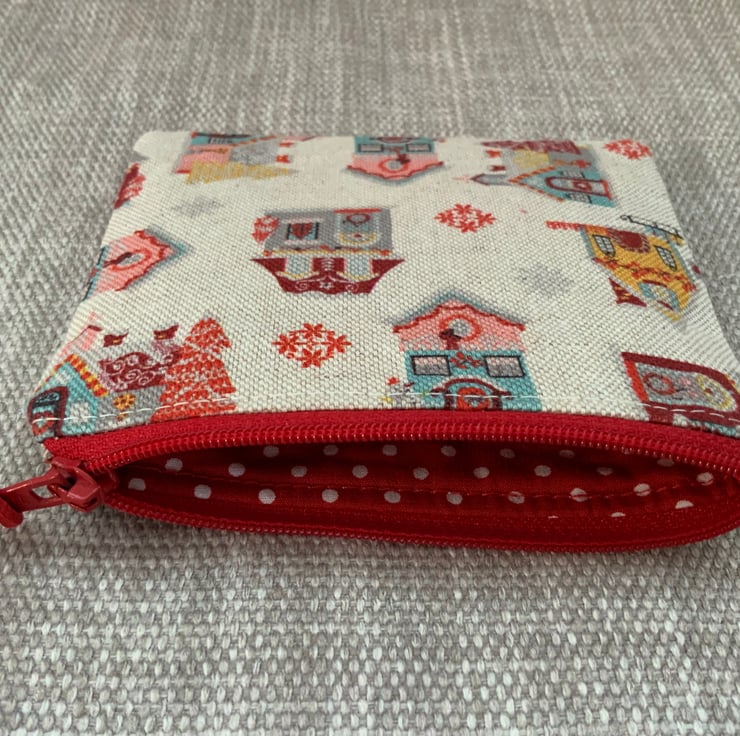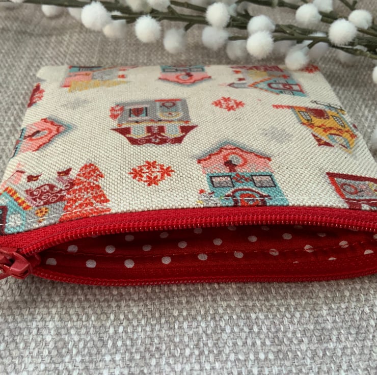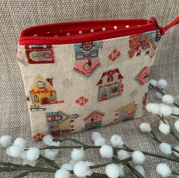 Beautiful coin purse made from cotton fabric in a scandi house design. It is lightly interfaced to give a little structure. It is lined in a coordinating cotton fabric and finished with a faux suede cord attached to the zip.