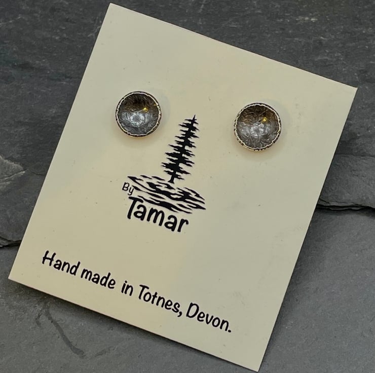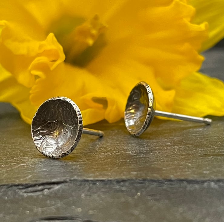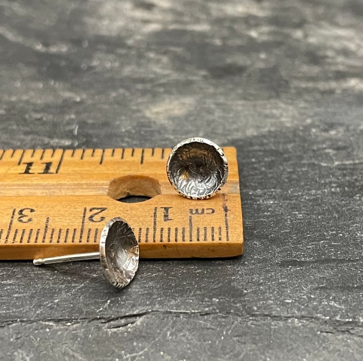 Sterling silver disks, domed and oxidised to create tiny simple studs. These studs shimmer and create the illusion of a set stone. I have hammered them to create extra sparkle.