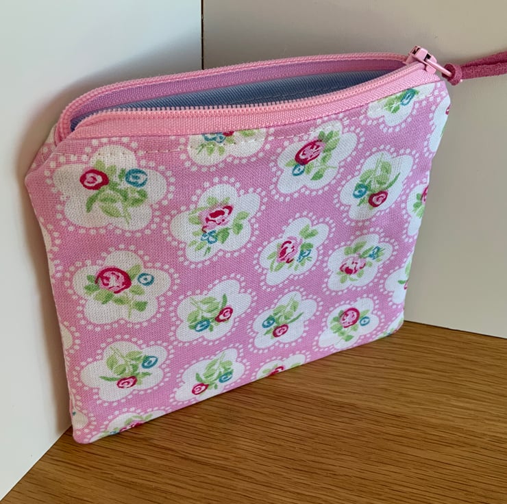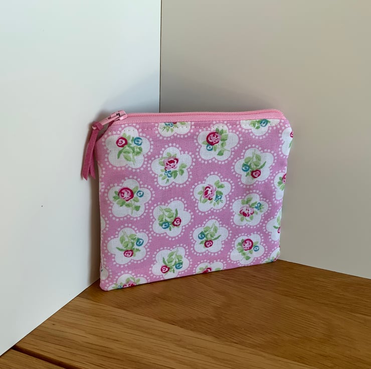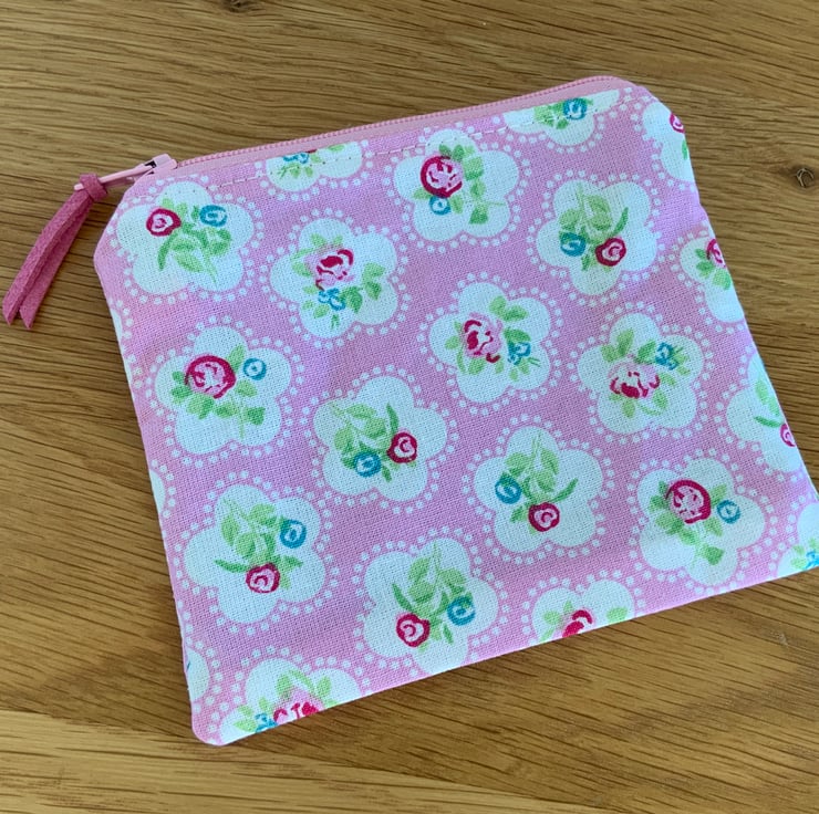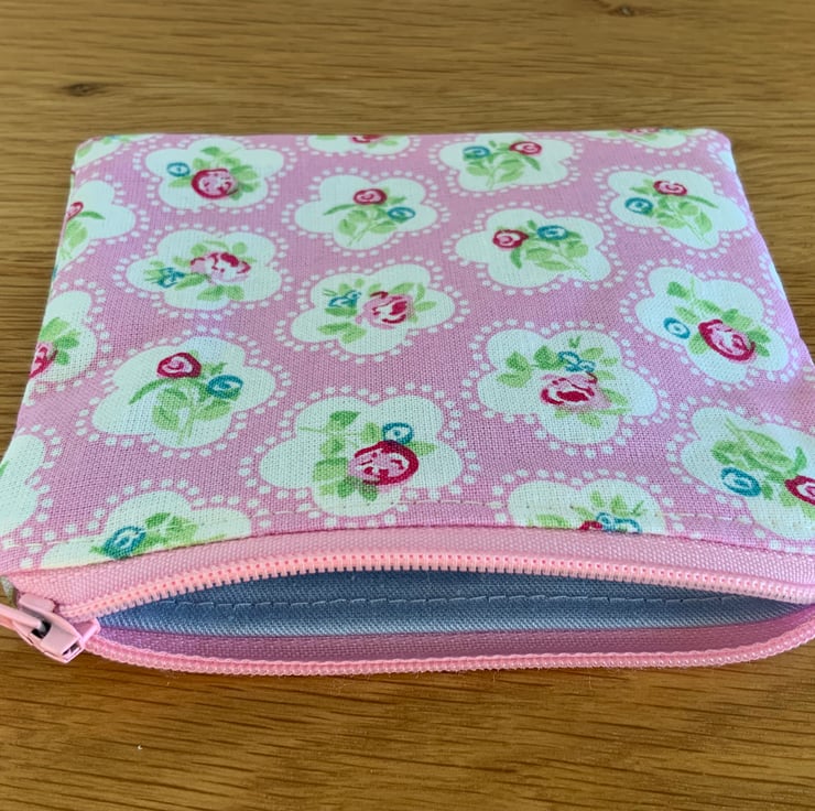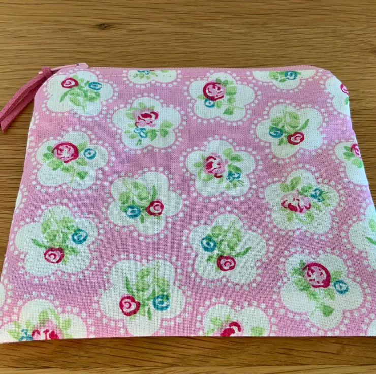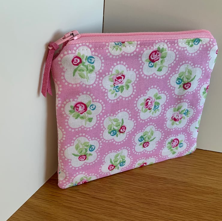 Beautiful coin purse made from cotton fabric with a floral design. It is lightly interfaced to give a little structure. It is lined in a coordinating cotton fabric and finished with a faux suede cord attached to the zip.