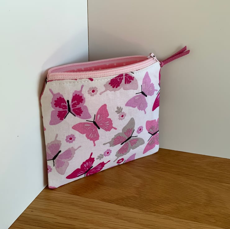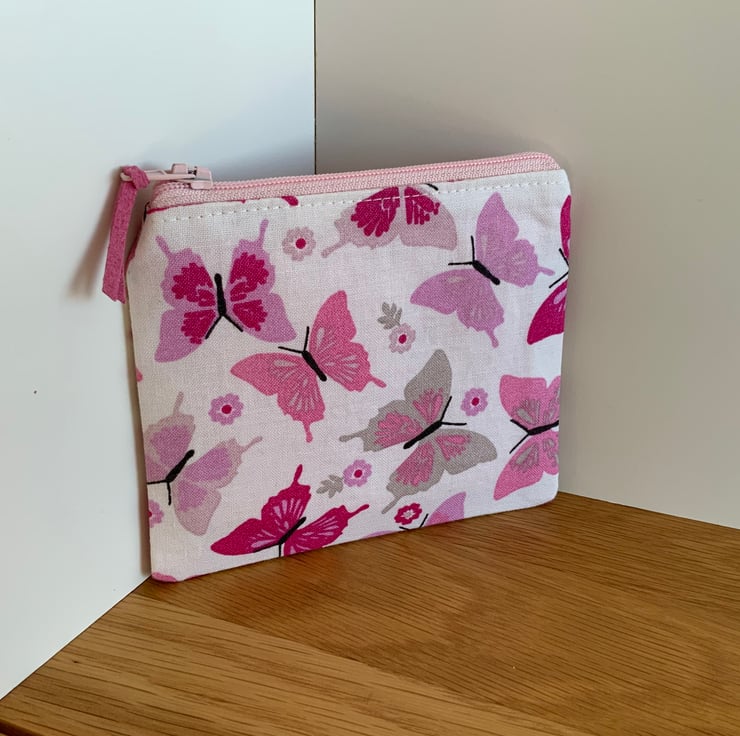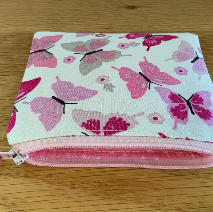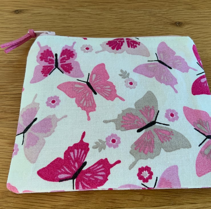 Beautiful coin purse made from cotton fabric with a butterfly design. It is lightly interfaced to give a little structure. It is lined in a coordinating cotton fabric and finished with a faux suede cord attached to the zip.