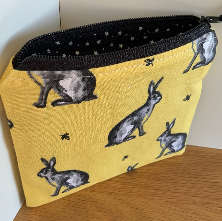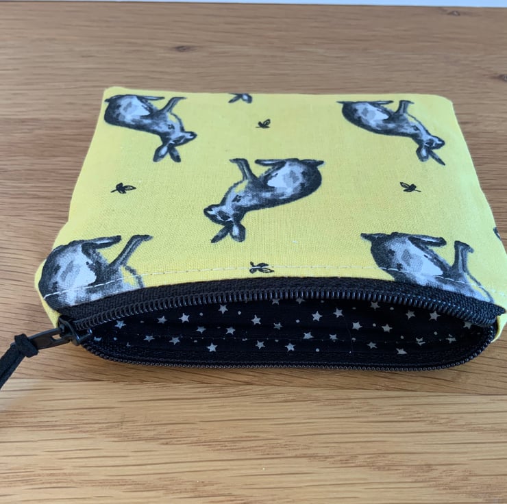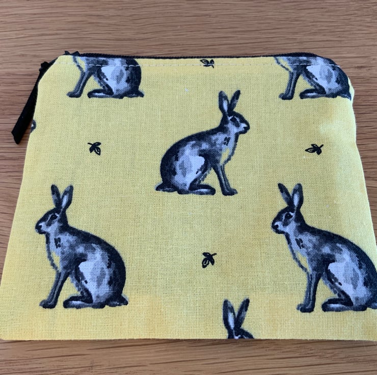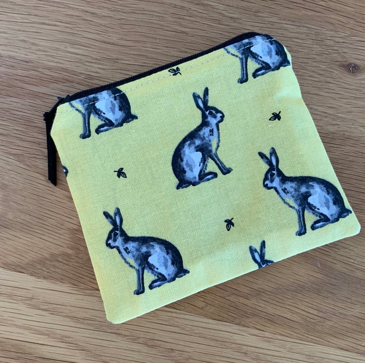 Beautiful coin purse made from cotton fabric with a hare design. It is lightly interfaced to give a little structure. It is lined in a coordinating cotton fabric and finished with a faux suede cord attached to the zip.