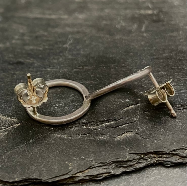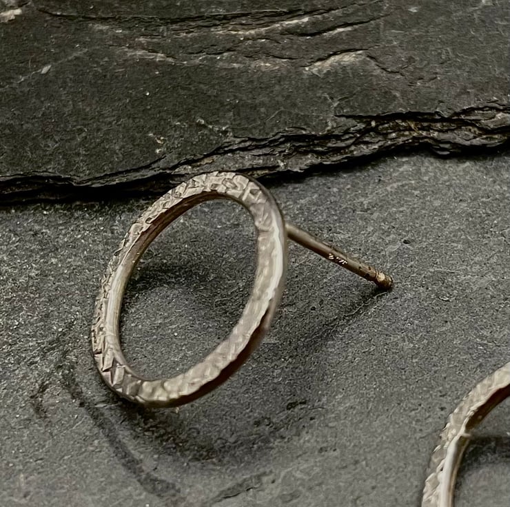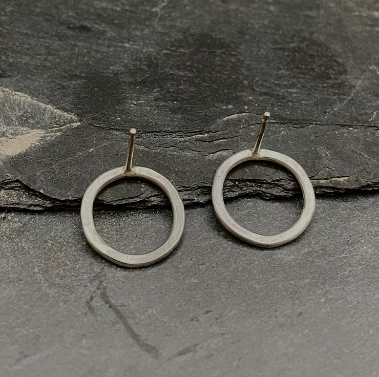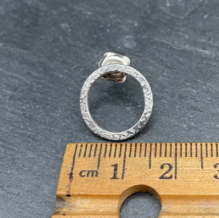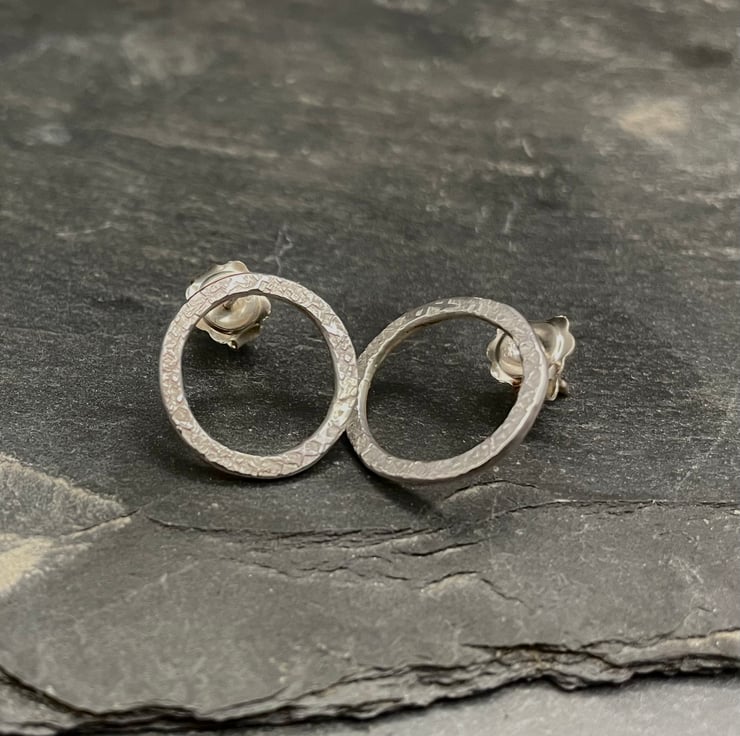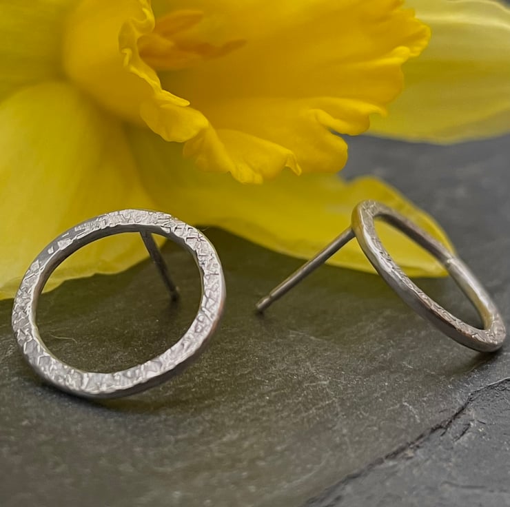 Sterling silver circles, hammered and shaped to create tiny simple studs. These silver earrings sit comfortably on the ear, perfect for wearing all day.