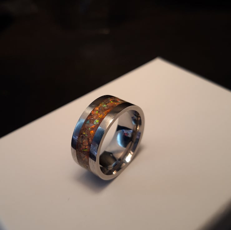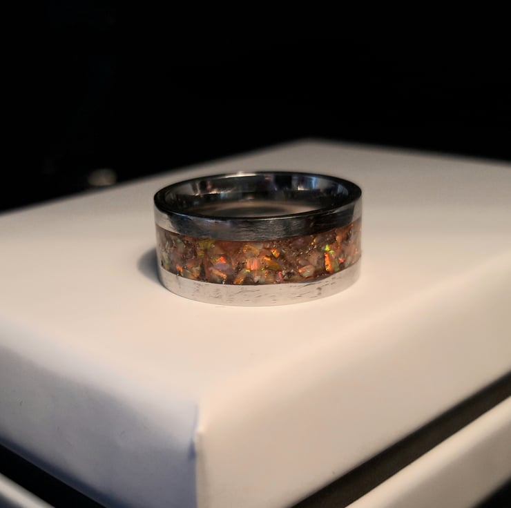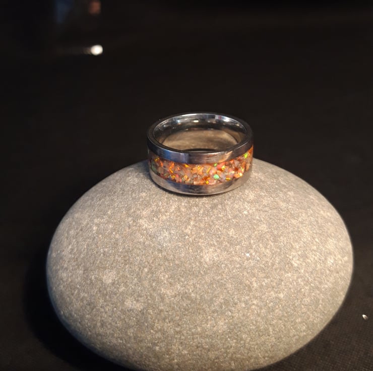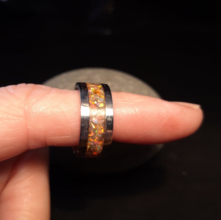 This gorgeous little ring is made from steel with a crushed bello opal inlay or orange, green and yellow. It sparkles in the light and is a real statement piece. It is a uk size k.