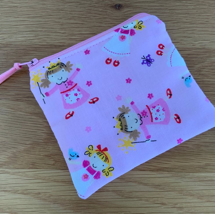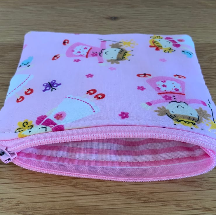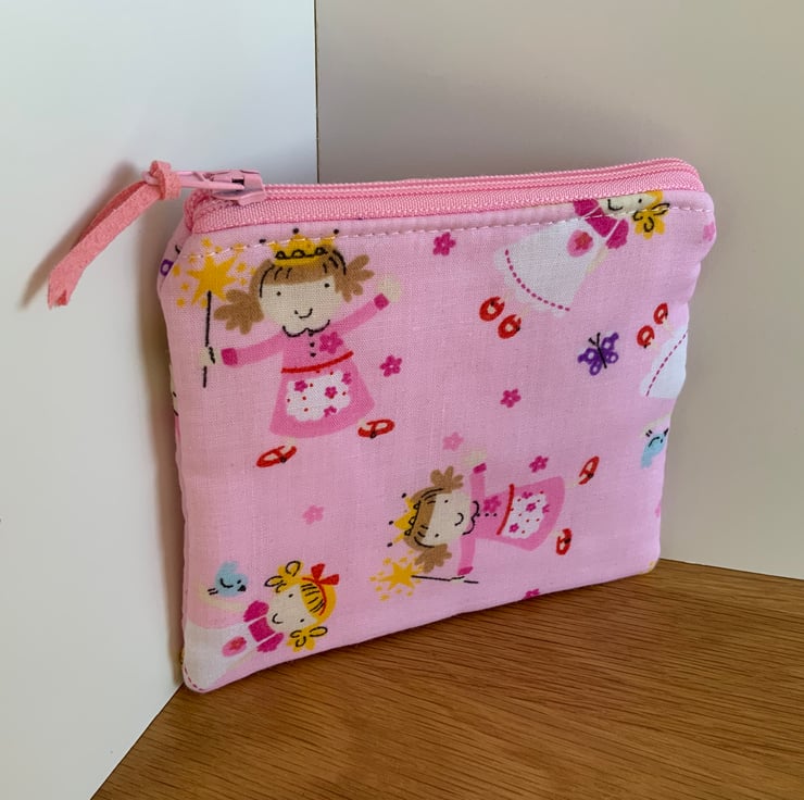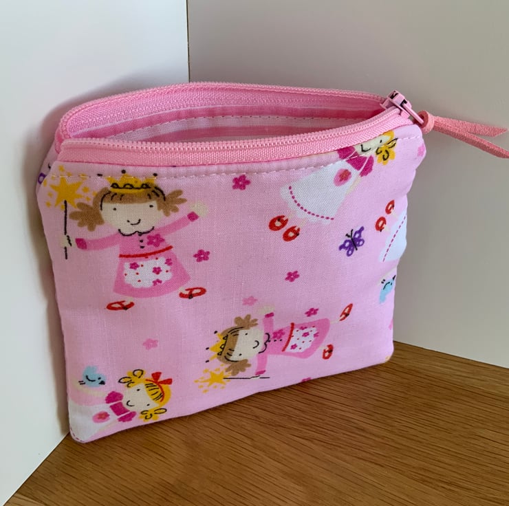 Children’s coin purse made from cotton fabric in a pink fairy design. It has a layer of interlining in between to give it a little structure. It is lined in a coordinating cotton fabric and finished with a faux suede cord attached to the zip.