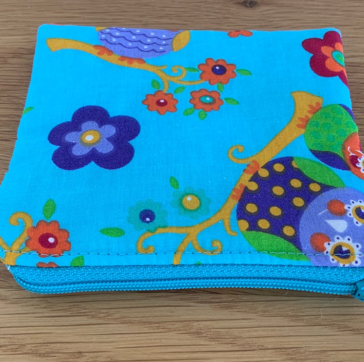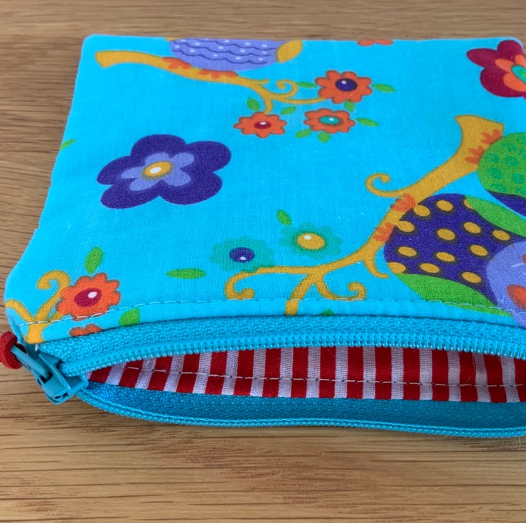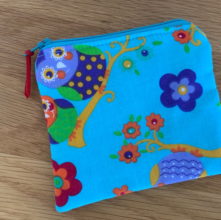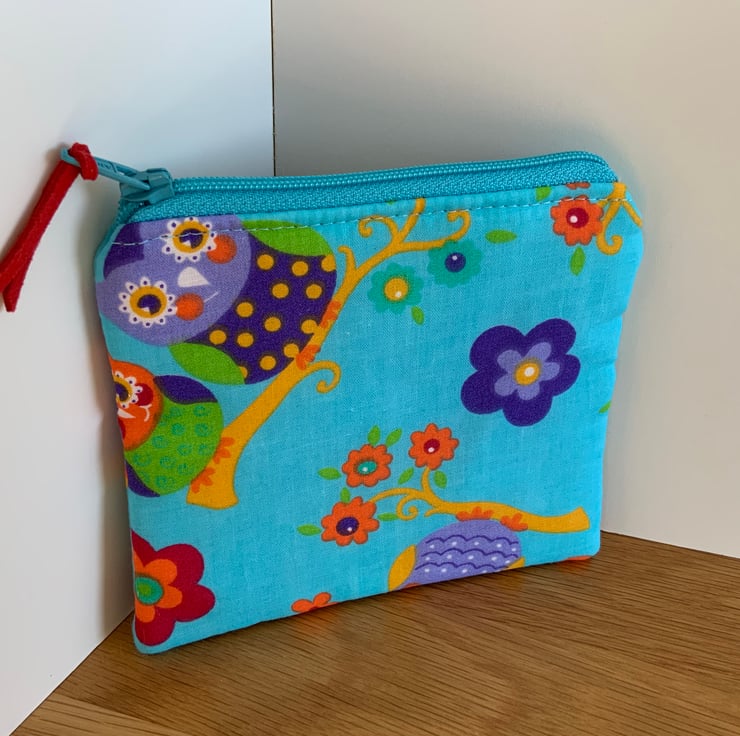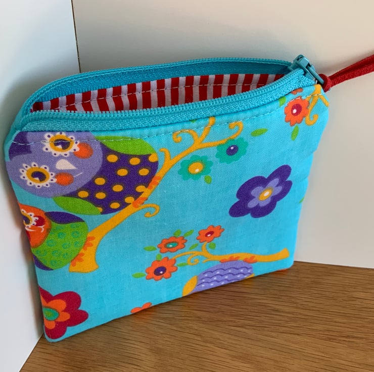 Children’s coin purse made from cotton fabric in an owl design. It has a layer of interlining in between to give it a little structure. It is lined in a coordinating cotton fabric and finished with a faux suede cord attached to the zip.