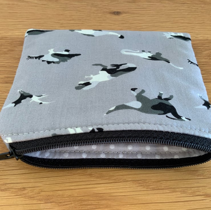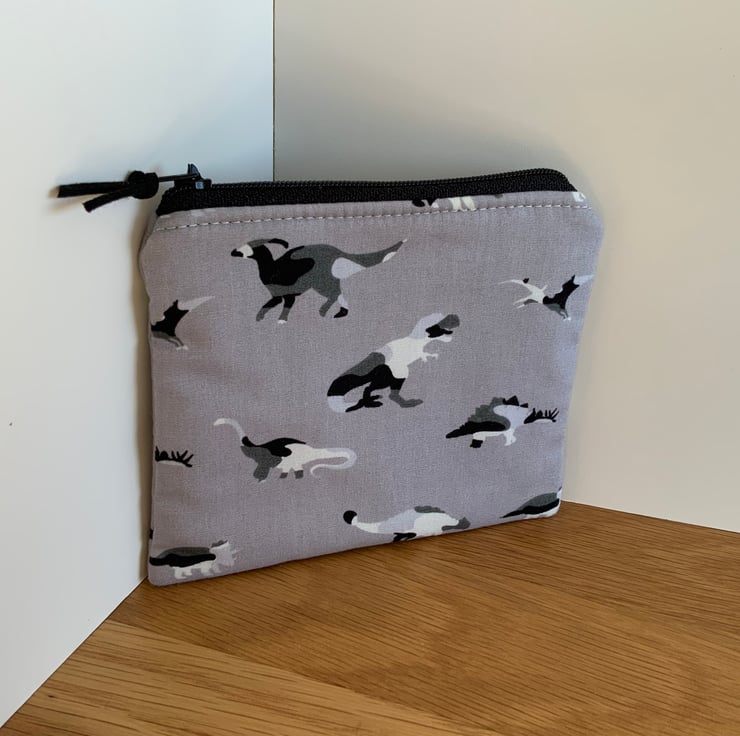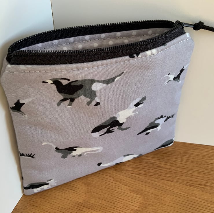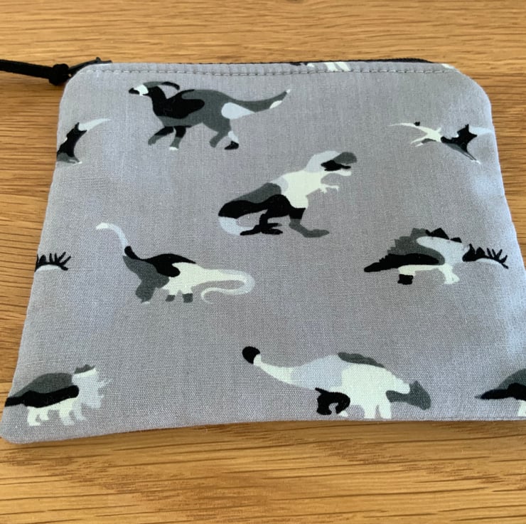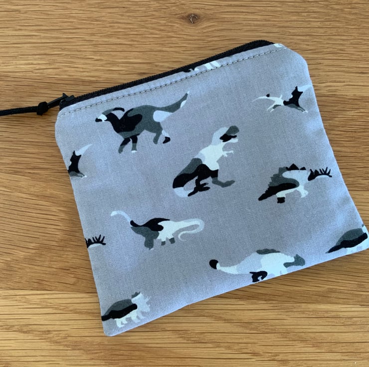 Children’s coin purse made from cotton fabric in a dinosaur design. It has a layer of interlining in between to give it a little structure. It is lined in a coordinating cotton fabric and finished with a faux suede cord attached to the zip.